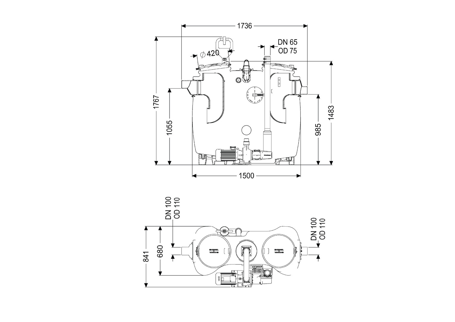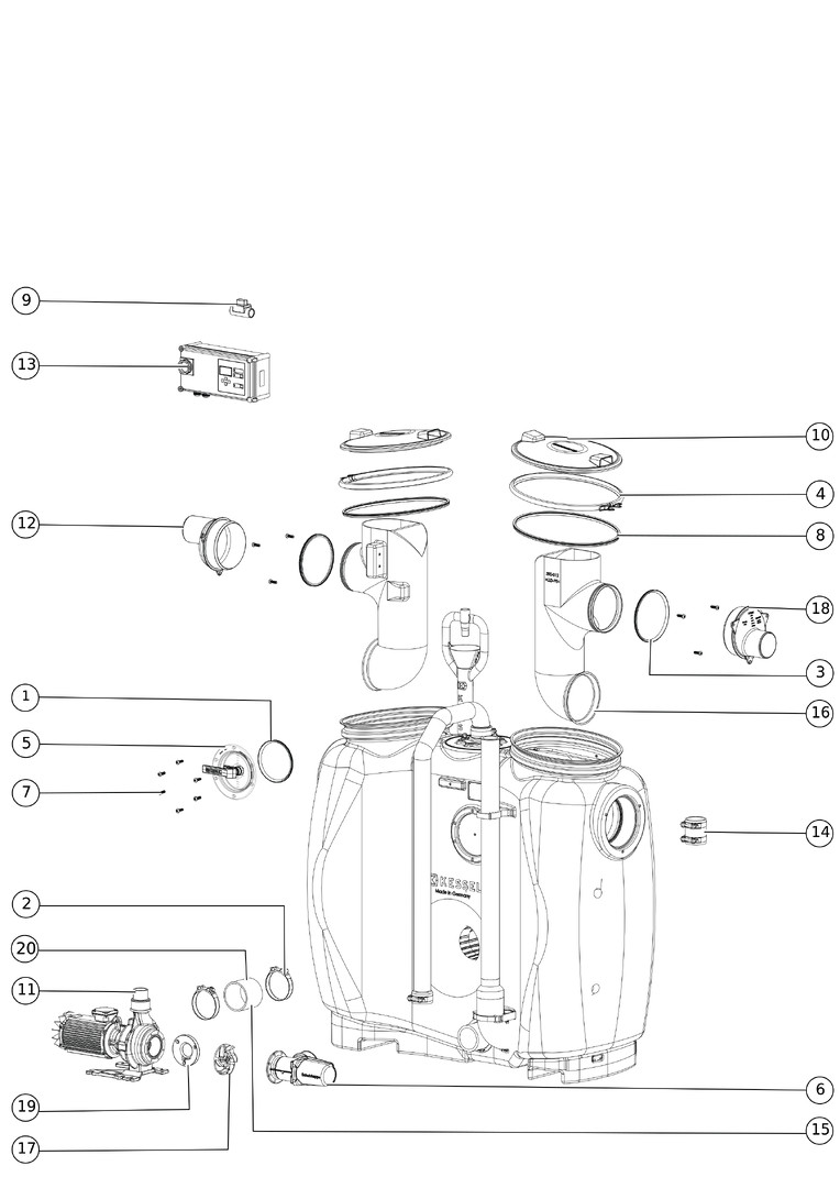 aus PE, Einbau in frostgeschützten Räumen, mit Direktentsorgung, programmgesteuertem Schredder-Mix-System, Schaltgerät, Schauglas, Fülleinrichtung und Pumpe, die Fließrichtung kann durch Austauschen des Zu- und Ablaufstutzens geändert werden, Pumpenleistung 3 kW, Kabellänge für Anbauteile 5 m, Anlage komplett montiert, Zubehör Probenahmeeinrichtung, Hebeanlagen, Fernbedienung