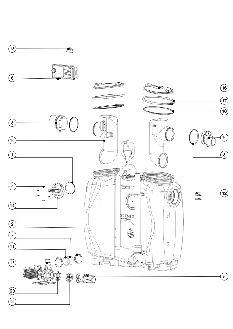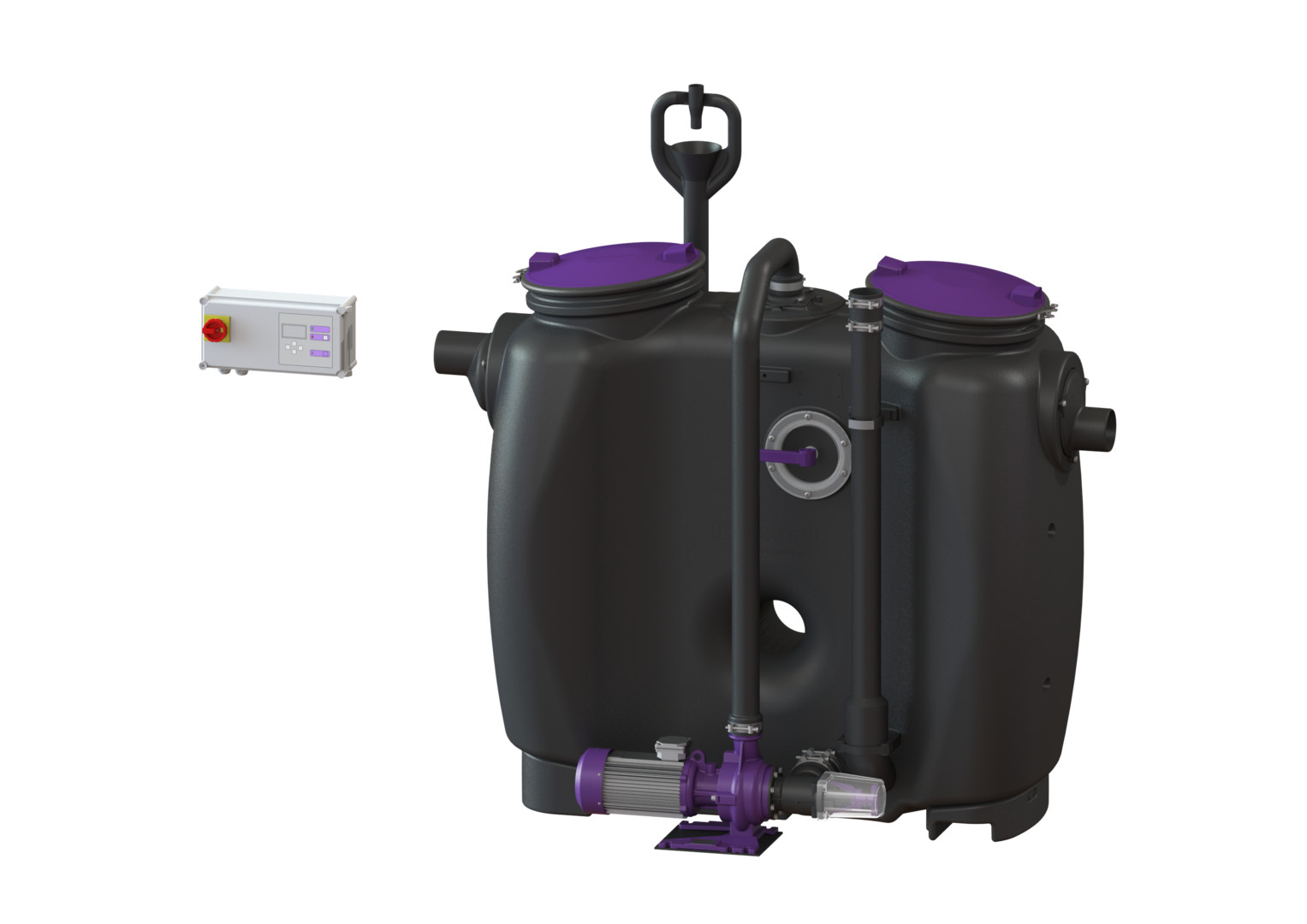 aus PE, Einbau in frostgeschützten Räumen, mit Direktentsorgung, programmgesteuertem Schredder-Mix-System, Schaltgerät, Schauglas, Fülleinrichtung und Pumpe, die Fließrichtung kann durch Austauschen des Zu- und Ablaufstutzens geändert werden, Pumpenleistung 3 kW, Kabellänge für Anbauteile 5 m, Anlage komplett montiert, Zubehör Probenahmeeinrichtung, Hebeanlagen, Fernbedienung