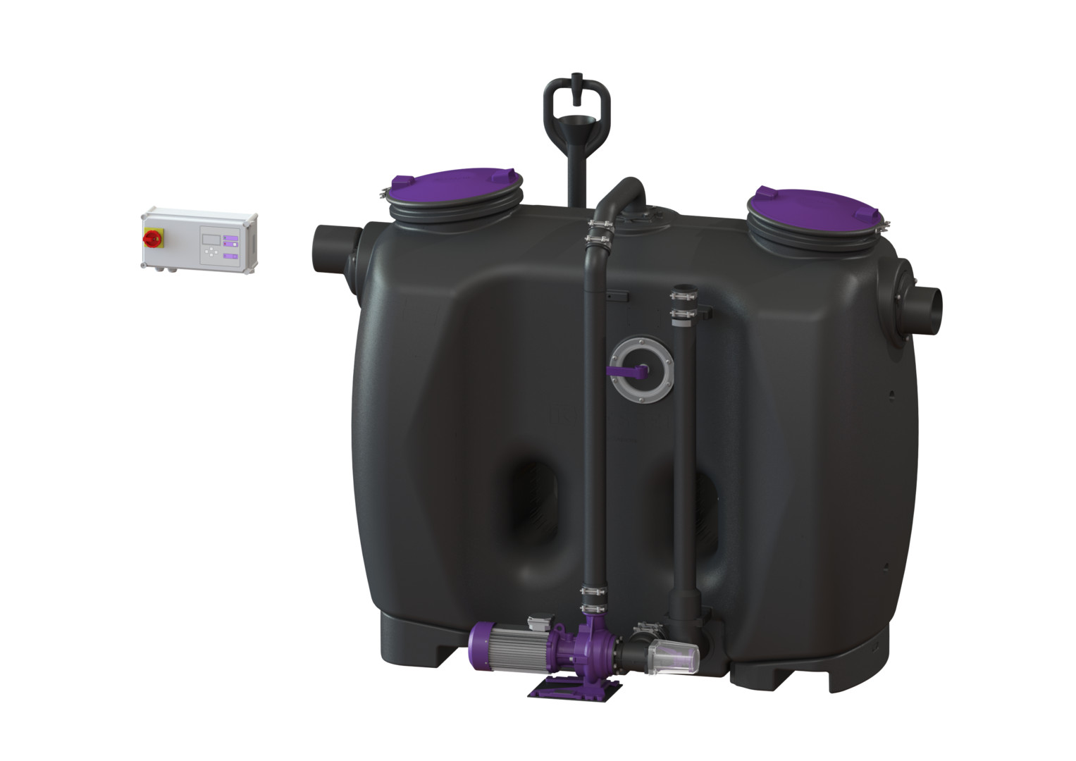 aus PE, Einbau in frostgeschützten Räumen, mit Direktentsorgung, programmgesteuertem Schredder-Mix-System, Schaltgerät, Schauglas, Fülleinrichtung und Pumpe, die Fließrichtung kann durch Austauschen des Zu- und Ablaufstutzens geändert werden, Pumpenleistung 3 kW, Kabellänge für Anbauteile 5 m, Anlage komplett montiert, Zubehör Probenahmeeinrichtung, Hebeanlagen, Fernbedienung