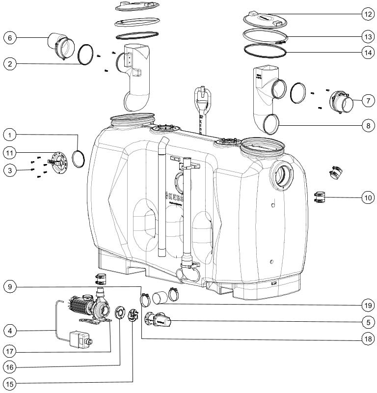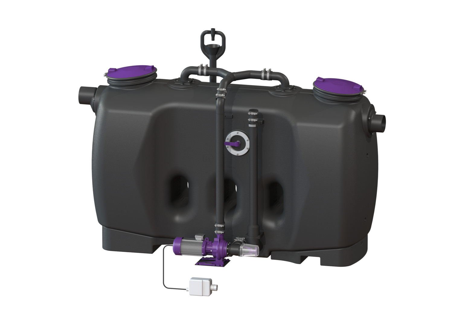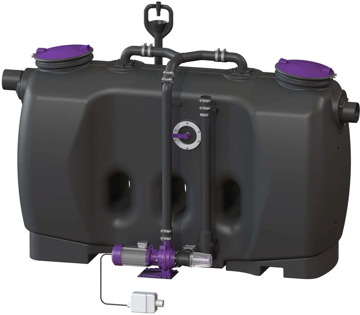 mit Direktentsorgung und Schredder-Mix-System, nach DIN EN 1825 und DIN 4040-100, aus Kunststoff, Pumpenleistung 3 kW, mit Fülleinrichtung und Fernbedienung, zur freien Aufstellung in frostgeschützten Räumen Ausführung in Fließrichtung rechts, kann durch Austauschen des Zu-/Ablaufstutzens in Fließrichtung links geändert werden. Zubehör: Schauglas, Probeentnahmeeinrichtung, Hebeanlagen.