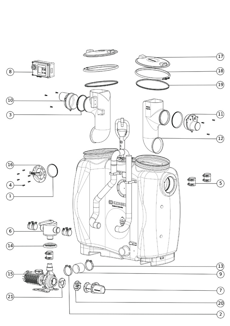aus PE, Einbau in frostgeschützten Räumen, mit manueller Entsorgungs- und Reinigungseinrichtung, Schredder-Mix-System, Schaltgerät, Schauglas, Fülleinrichtung und Pumpe, die Fließrichtung kann durch Austauschen des Zu- und Ablaufstutzens geändert werden, Pumpenleistung 3 kW, Kabellänge für Anbauteile 5 m, Anlage komplett montiert, Zubehör Probenahmeeinrichtung, Hebeanlagen