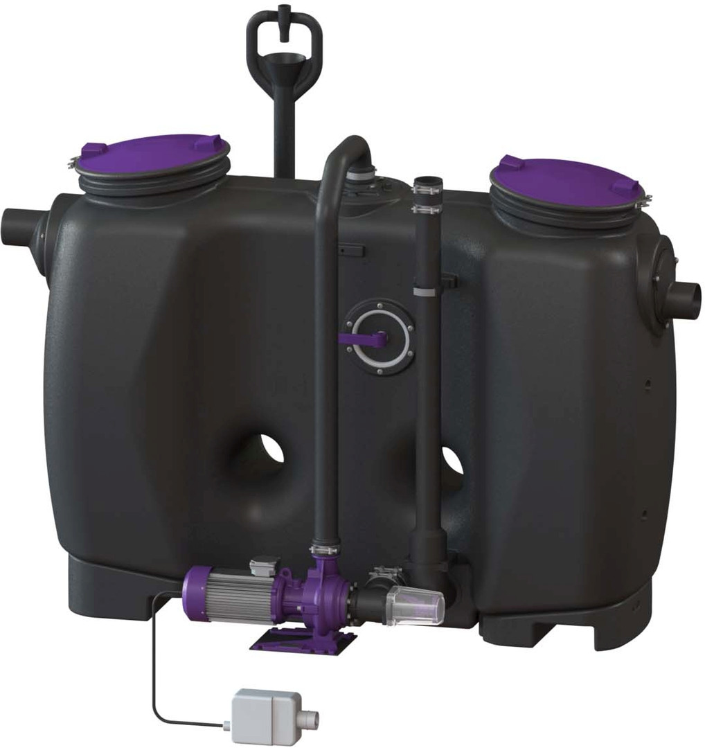 aus PE, Einbau in frostgeschützten Räumen, mit Direktentsorgung, Schredder-Mix-System, mit/ohne Schauglas, Fülleinrichtung, Pumpe, die Fließrichtung kann durch Austauschen des Zu- und Ablaufstutzens geändert werden, Pumpenleistung 3 kW, Kabellänge für Anbauteile 5 m, Anlage komplett montiert, Zubehör Probenahmeeinrichtung, Hebeanlagen, Schauglas