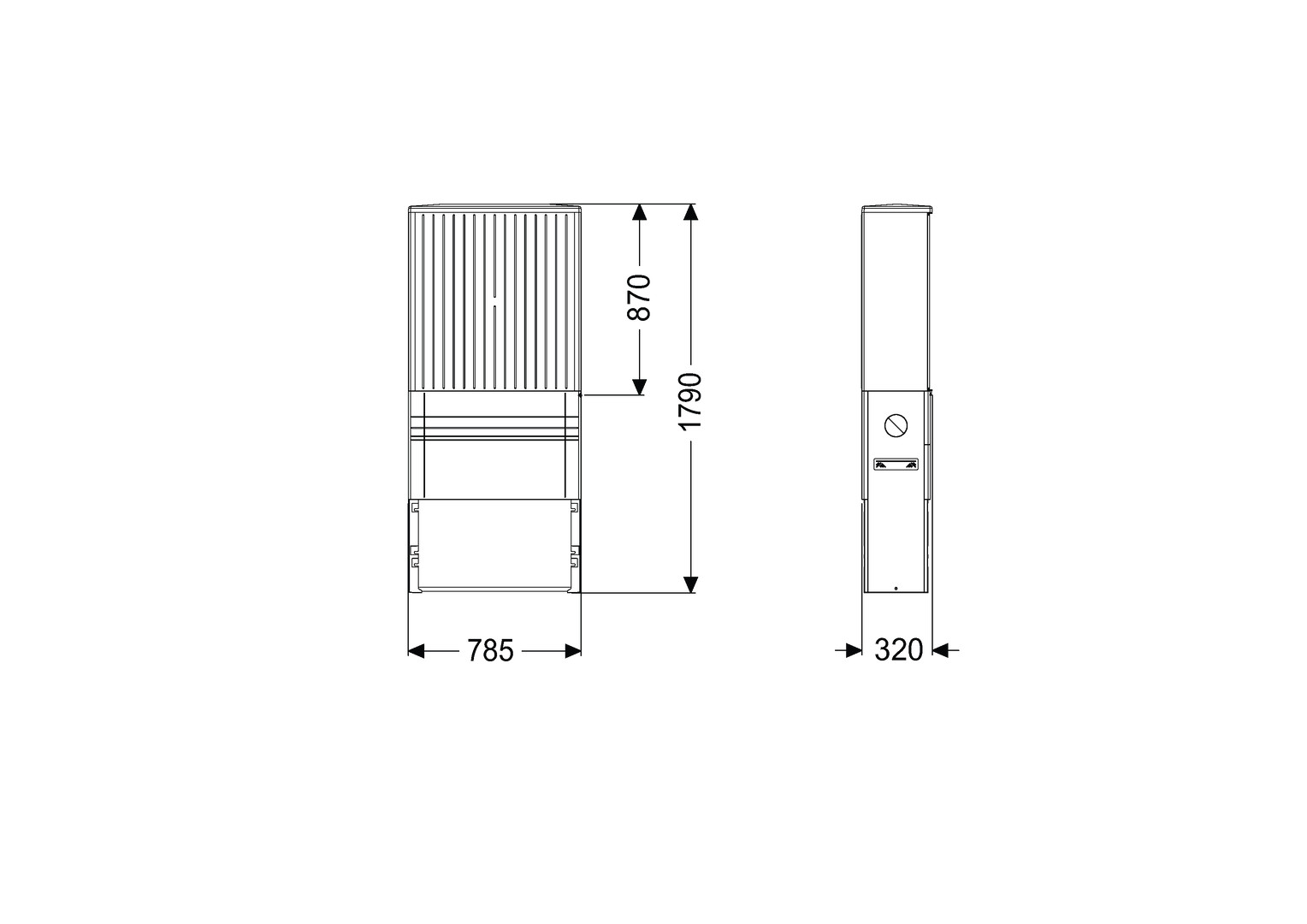 Tiefe 320 mm, zum Einbau von Schaltgeräten, Modem, Thermostat, Warnleuchte im Außenbereich, Gesamthöhe 1740 mm (Artikel 97 724 1790 mm), Höhe 870 mm (über Bodenniveau), bei starker Sonneneinwirkung auf die Freiluftsäule empfehlen wir die Montage eines optionalen Kühlgerätes