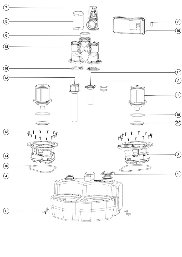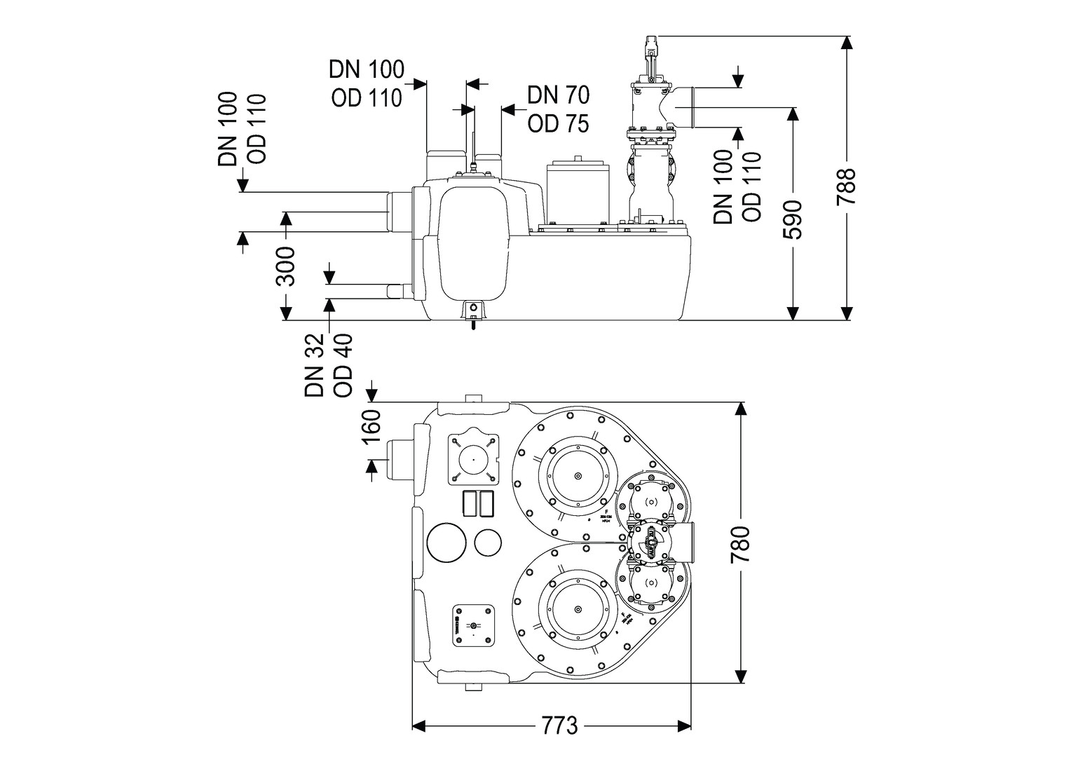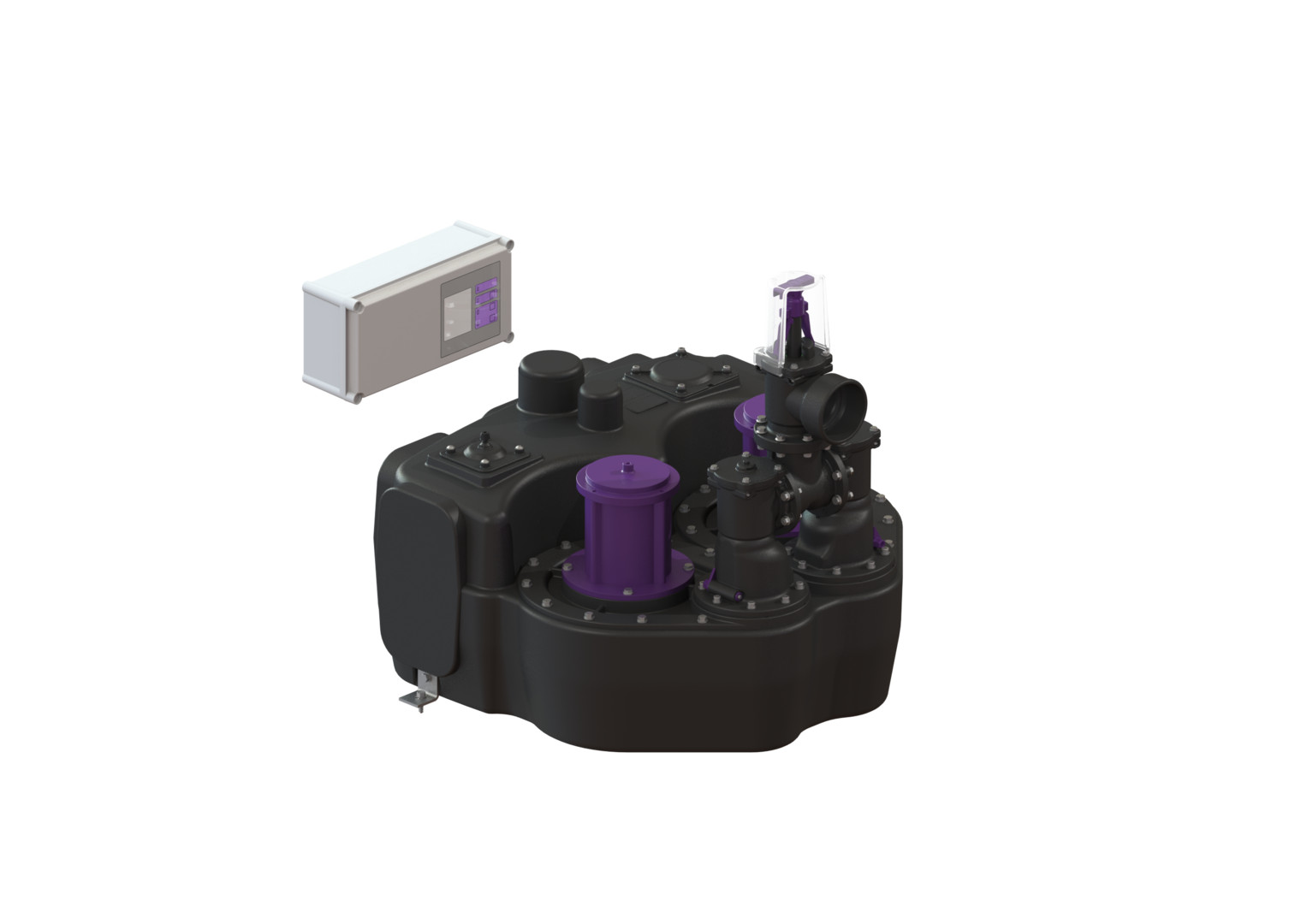 mit Standard-Schaltgerät, Anlage mit zwei Pumpen, zur freien Aufstellung, Sammelbehälter aus PE, mit Freistromrad, Pumpen Typ SPF, Behältervolumen 120 l, max. Nutzvolumen 50 l, schalldämmender Unterlegmatte, elastische Schlauchverbindung DN 100, Druckabgang senkrecht DN 100/OD 110 ohne Absperreinrichtung, waagerecht DN 100/OD 110 mit Absperreinrichtung, Kabellänge 5 m