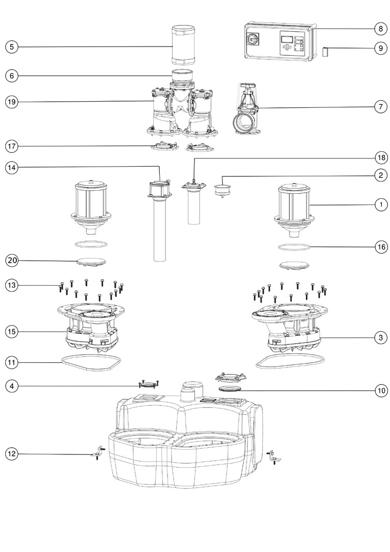 mit Comfort-Schaltgerät, Anlage mit zwei Pumpen, zur freien Aufstellung, Sammelbehälter aus PE, mit Freistromrad, Pumpen Typ SPF, Behältervolumen 120 l, max. Nutzvolumen 50 l, schalldämmender Unterlegmatte, 230 V-Versionen steckerfertig, elastische Schlauchverbindung DN 100, Druckabgang senkrecht DN 100/OD 110 ohne Absperreinrichtung, waagerecht DN 100/OD 110 mit Absperreinrichtung, Kabellänge 5 m