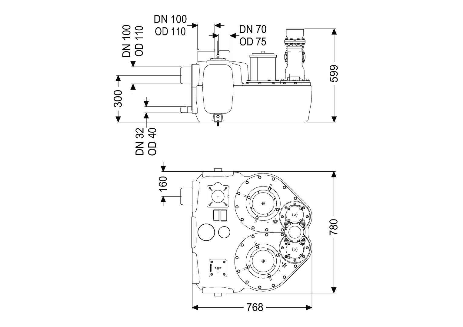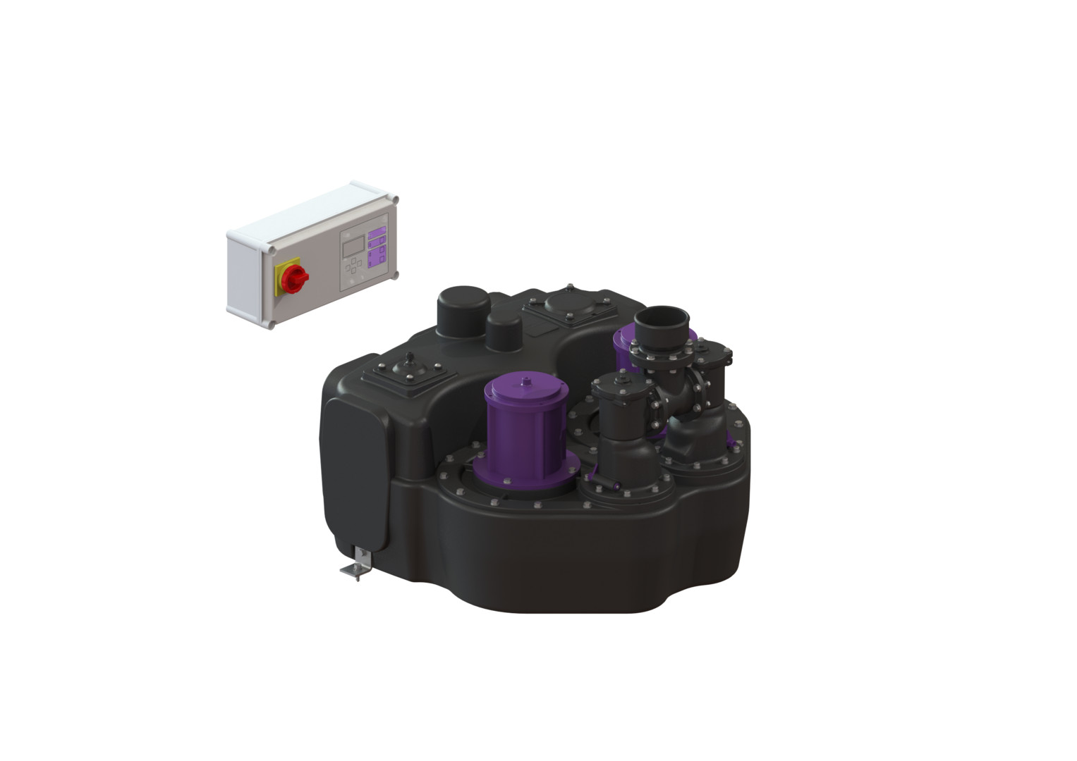 mit Comfort-Schaltgerät, Anlage mit zwei Pumpen, zur freien Aufstellung, Sammelbehälter aus PE, mit Freistromrad, Pumpen Typ SPF, Behältervolumen 120 l, max. Nutzvolumen 50 l, schalldämmender Unterlegmatte, 230 V-Versionen steckerfertig, elastische Schlauchverbindung DN 100, Druckabgang senkrecht DN 100/OD 110 ohne Absperreinrichtung, waagerecht DN 100/OD 110 mit Absperreinrichtung, Kabellänge 5 m