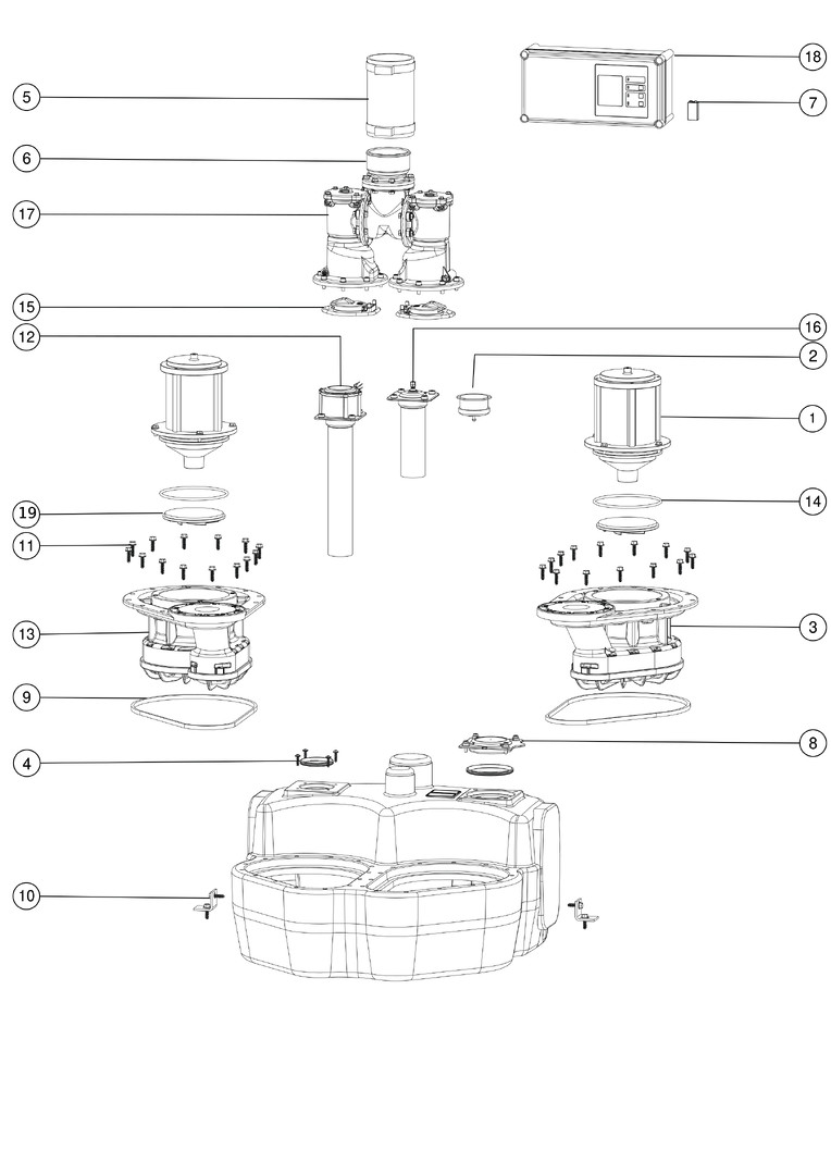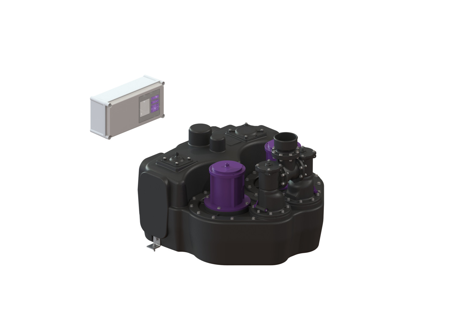 mit Standard-Schaltgerät, Anlage mit zwei Pumpen, zur freien Aufstellung, Sammelbehälter aus PE, mit Freistromrad, Pumpen Typ SPF, Behältervolumen 120 l, max. Nutzvolumen 50 l, schalldämmender Unterlegmatte, elastische Schlauchverbindung DN 100, Druckabgang senkrecht DN 100/OD 110 ohne Absperreinrichtung, waagerecht DN 100/OD 110 mit Absperreinrichtung, Kabellänge 5 m