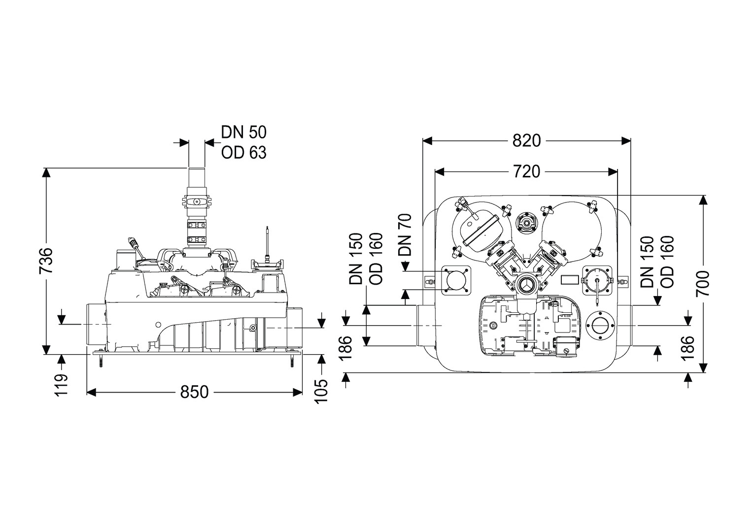 mit bauseitiger Druckleitung, 850 x 700 mm, 230 V, für Grau- und Schwarzwasser, Einbau in eine freiliegende Abwasserleitung in frostgeschützten Räumen, für fäkalienfreies oder fäkalienhaltiges Abwasser, für Anschluss an eine Druckleitung, Behälter aus PE, Pumpe mit Freistromrad, Zulauf/Auslauf DN 150/OD 160, Druckabgang DN 50/OD 60, selbsttätiges Verschlusssystem mit handverriegelbarem Notverschluss (FKA motorisch betrieben), Comfort-Schaltgerät mit Selbstdiagnosesystem (SDS) und Displayanzeige der Betriebszustände, Rückflussverhinderer, Absperrschieber für die Druckleitung, Steckerfertig, Netzfrequenz 50 Hz, erforderliche Absicherung (Leitungsschutz) C 16 A, Schutzart Pumpe IP 68 (3 m/48 h), Schutzart Motor IP 68