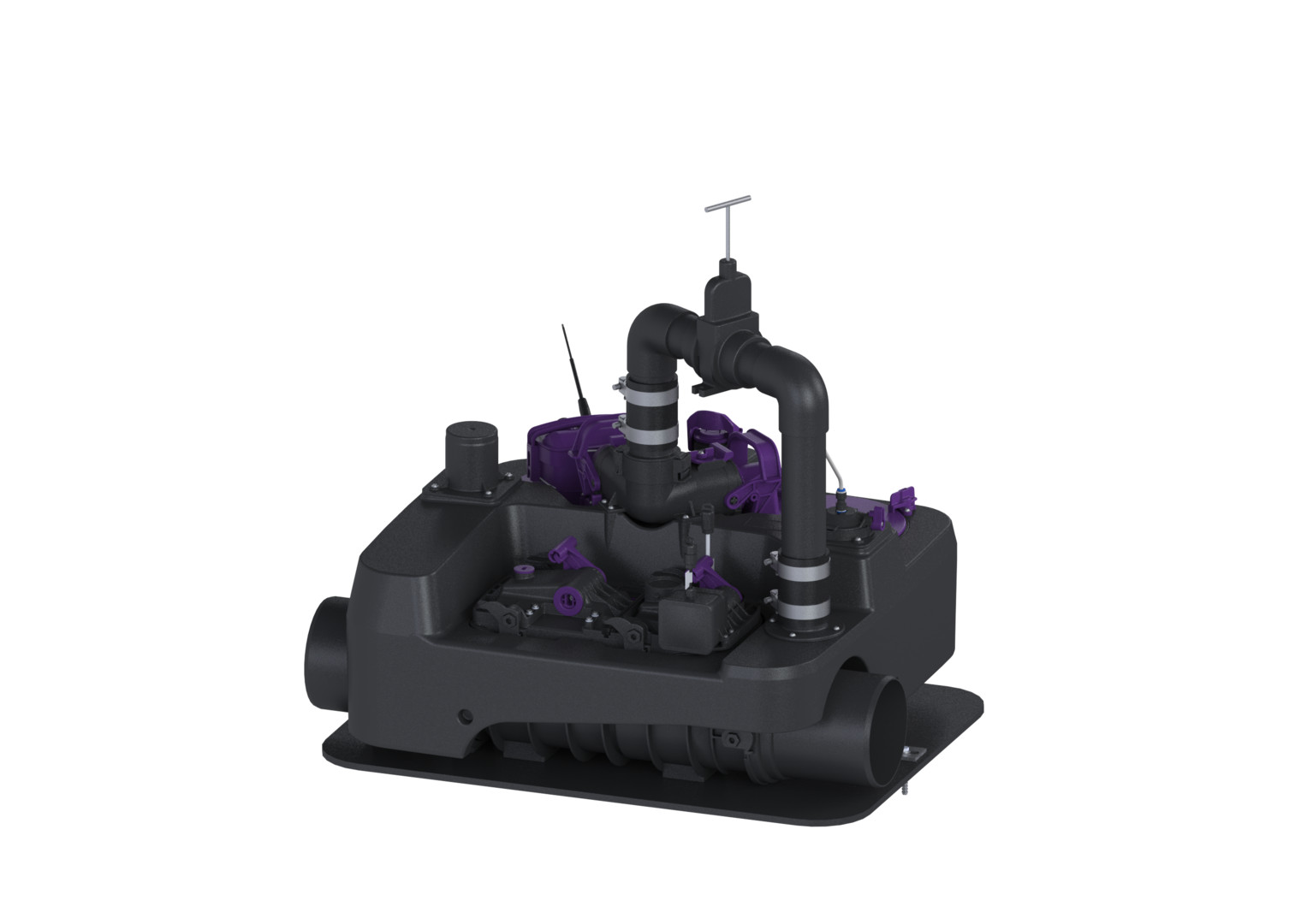 mit integrierter Druckleitung, 850 x 700 mm, 230 V, für Grau- und Schwarzwasser, Einbau in eine freiliegende Abwasserleitung in frostgeschützten Räumen, für fäkalienfreies oder fäkalienhaltiges Abwasser, Behälter aus PE, Pumpe mit Freistromrad, Zulauf/Auslauf DN 150/OD 160, Druckabgang DN 50/OD 63, selbsttätiges Verschlusssystem mit handverriegelbarem Notverschluss (FKA motorisch betrieben), Comfort-Schaltgerät mit Selbstdiagnosesystem (SDS) und Displayanzeige der Betriebszustände, Rückflussverhinderer, Absperrschieber für die Druckleitung, Steckerfertig, Netzfrequenz 50 Hz, erforderliche Absicherung (Leitungsschutz) C 16 A, Schutzart Pumpe IP 68 (3 m/48 h), Schutzart Motor IP 68