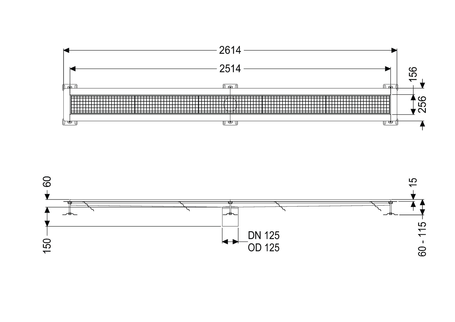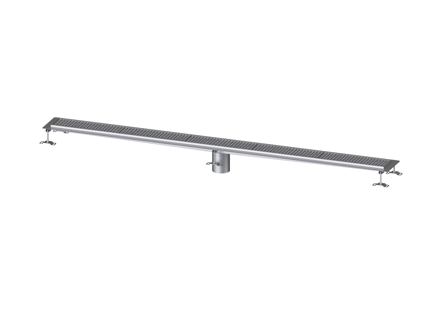 zum Einbau in die Bodenplatte, Material Edelstahl 1.4301 (V2A), Materialstärke 2 mm, im Tauchbad gebeizt, Sichtstege geschliffen, Längs- und Quergefälle, Standfüße zur Höhennivellierung, Auslaufstutzen aus Edelstahl, Rinnenprofil für Abdichtungen im Verbund, mit Kleberand 15 mm tief und 50 mm nach außen angekantet, umlaufend, mit verschweißten Gehrungen, Abdeckung Gitterrost aus Edelstahl, rutschhemmend R12, im Tauchbad gebeizt, Maschenweite 23 x 23 mm, Belastungsklasse L 15 (1,5 t), optionales Zubehör passende Ablaufgrundkörper System 125, Variofix Ablaufstutzen aus Edelstahl, bis 5 mm radial verschiebbar