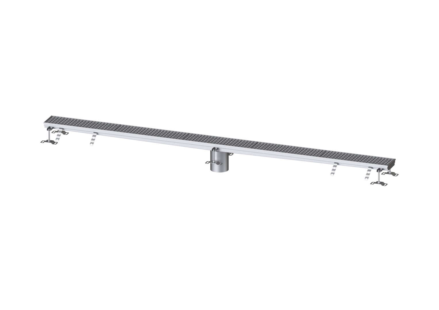 zum Einbau in die Bodenplatte, Material Edelstahl 1.4301 (V2A), Materialstärke 2 mm, im Tauchbad gebeizt, Sichtstege geschliffen, Längs- und Quergefälle, Standfüße zur Höhennivellierung, Auslaufstutzen aus Edelstahl, Abdeckung Gitterrost aus Edelstahl, rutschhemmend R12, im Tauchbad gebeizt, Maschenweite 23 x 23 mm, Belastungsklasse L 15 (1,5 t), optionales Zubehör passende Ablaufgrundkörper System 125, Variofix Ablaufstutzen aus Edelstahl, bis 5 mm radial verschiebbar