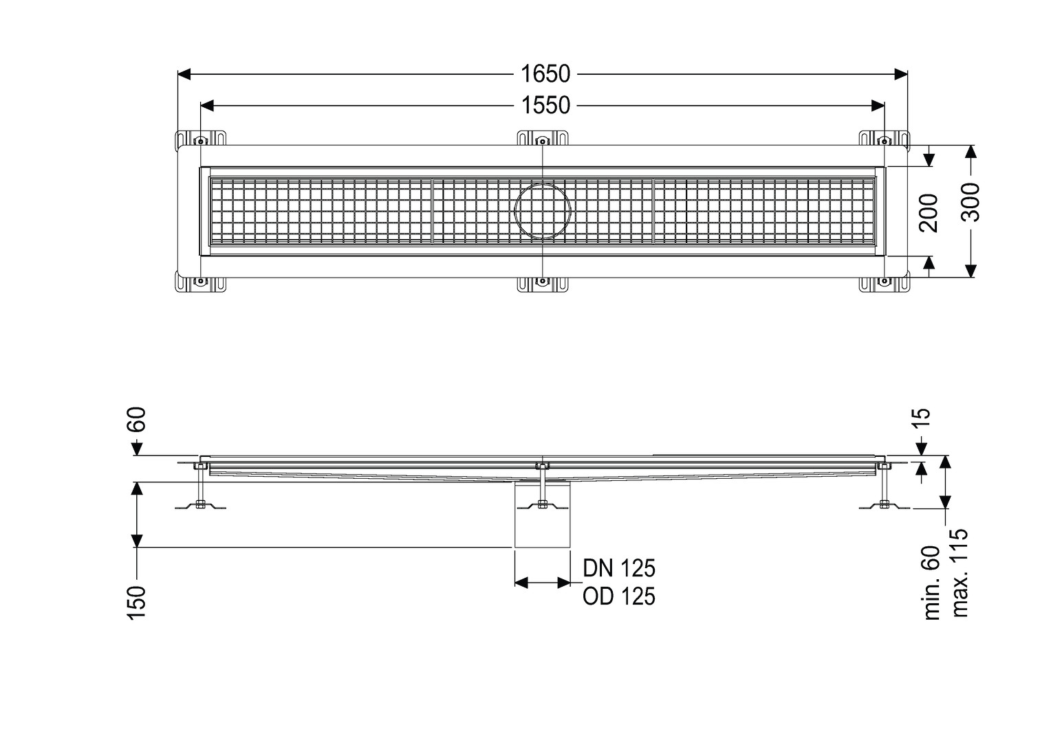 zum Einbau in die Bodenplatte, Material Edelstahl 1.4301 (V2A), Materialstärke 2 mm, im Tauchbad gebeizt, Sichtstege geschliffen, Längs- und Quergefälle, Standfüße zur Höhennivellierung, Auslaufstutzen aus Edelstahl, Rinnenprofil für Abdichtungen im Verbund, mit Kleberand 15 mm tief und 50 mm nach außen angekantet, umlaufend, mit verschweißten Gehrungen, Abdeckung Gitterrost aus Edelstahl, rutschhemmend R12, im Tauchbad gebeizt, Maschenweite 23 x 23 mm, Belastungsklasse L 15 (1,5 t), optionales Zubehör passende Ablaufgrundkörper System 125, Variofix Ablaufstutzen aus Edelstahl, bis 5 mm radial verschiebbar