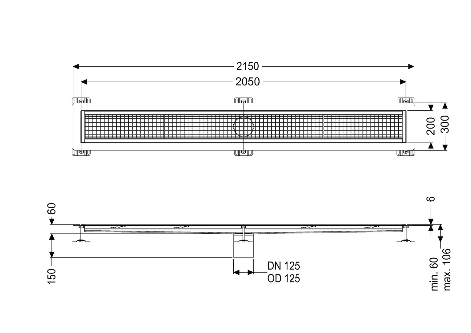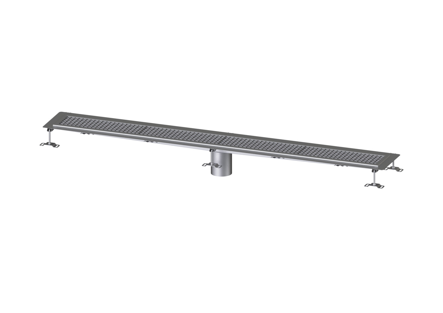zum Einbau in die Bodenplatte, Material Edelstahl 1.4301 (V2A), Materialstärke 1,5 mm, im Tauchbad gebeizt, Sichtstege geschliffen, Längs- und Quergefälle, Standfüße zur Höhennivellierung, Auslaufstutzen aus Edelstahl, Rinnenprofil in Anbindung an Bodenbeschichtungen (z. B. Epoxidharze), mit Kleberand 6 mm tief und 50 mm nach außen angekantet, umlaufend, mit verschweißten Gehrungen, Abdeckung Gitterrost aus Edelstahl, rutschhemmend R12, im Tauchbad gebeizt, Maschenweite 23 x 23 mm, Belastungsklasse L 15 (1,5 t), optionales Zubehör passende Ablaufgrundkörper System 125, Variofix Ablaufstutzen aus Edelstahl, bis 5 mm radial verschiebbar