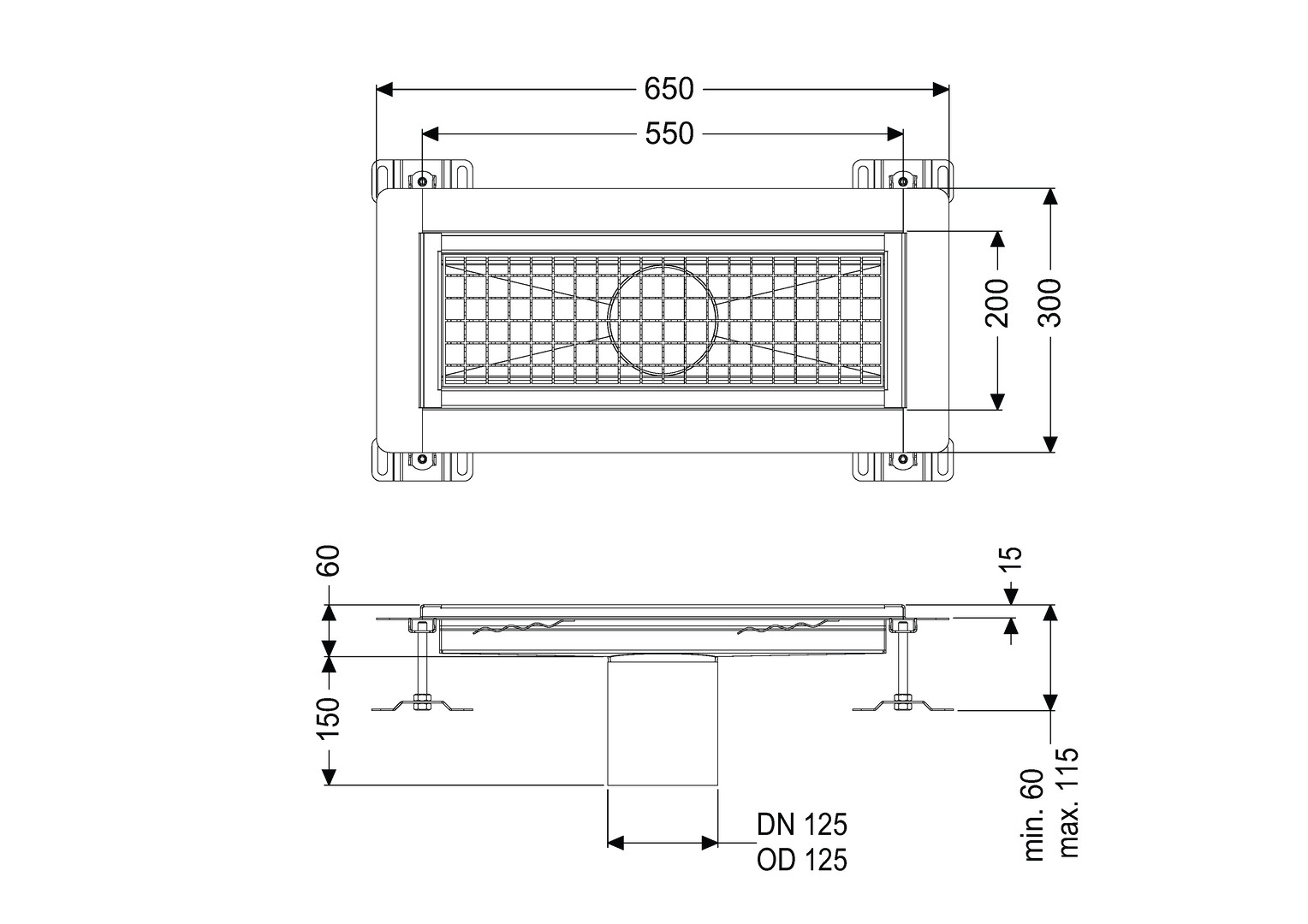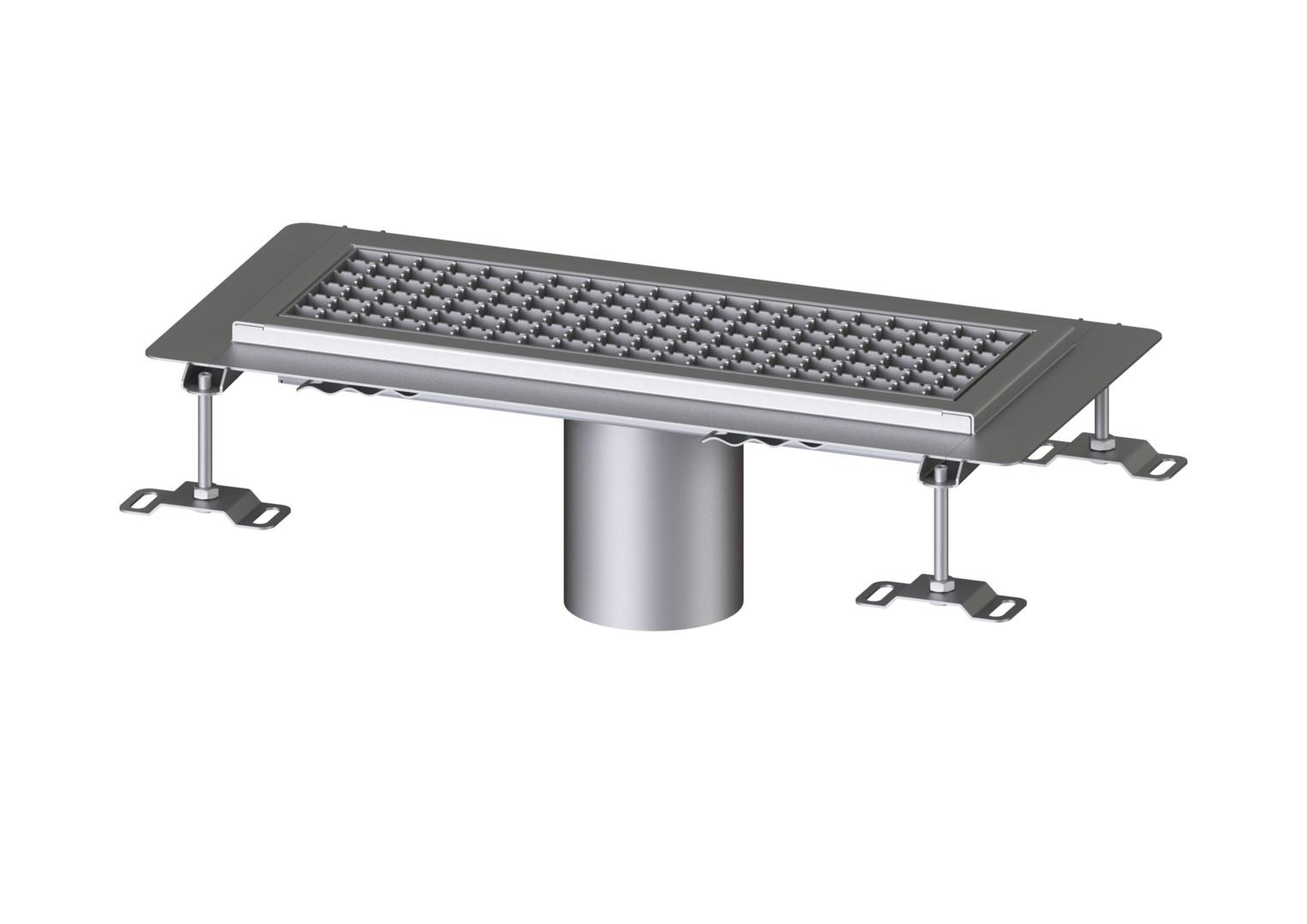 zum Einbau in die Bodenplatte, Material Edelstahl 1.4301 (V2A), Materialstärke 2 mm, im Tauchbad gebeizt, Sichtstege geschliffen, Längs- und Quergefälle, Standfüße zur Höhennivellierung, Auslaufstutzen aus Edelstahl, Rinnenprofil für Abdichtungen im Verbund, mit Kleberand 15 mm tief und 50 mm nach außen angekantet, umlaufend, mit verschweißten Gehrungen, Abdeckung Gitterrost aus Edelstahl, rutschhemmend R12, im Tauchbad gebeizt, Maschenweite 23 x 23 mm, Belastungsklasse L 15 (1,5 t), optionales Zubehör passende Ablaufgrundkörper System 125, Variofix Ablaufstutzen aus Edelstahl, bis 5 mm radial verschiebbar