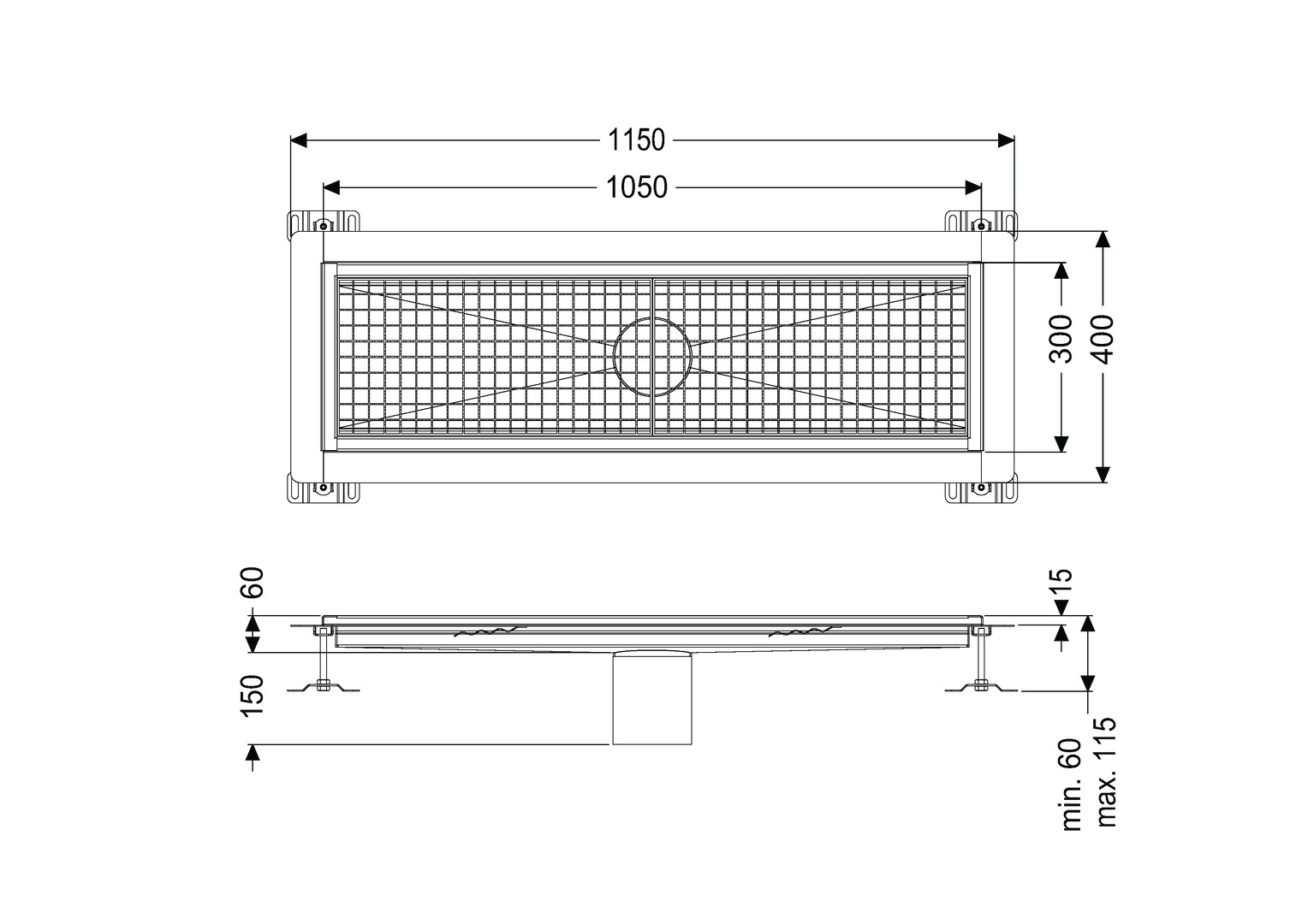 zum Einbau in die Bodenplatte, Material Edelstahl 1.4301 (V2A), Materialstärke 2 mm, im Tauchbad gebeizt, Sichtstege geschliffen, Längs- und Quergefälle, Standfüße zur Höhennivellierung, Auslaufstutzen aus Edelstahl, Rinnenprofil für Abdichtungen im Verbund, mit Kleberand 15 mm tief und 50 mm nach außen angekantet, umlaufend, mit verschweißten Gehrungen, Abdeckung Gitterrost aus Edelstahl, rutschhemmend R12, im Tauchbad gebeizt, Maschenweite 23 x 23 mm, Belastungsklasse L 15 (1,5 t), optionales Zubehör passende Ablaufgrundkörper System 125, Variofix Ablaufstutzen aus Edelstahl, bis 5 mm radial verschiebbar