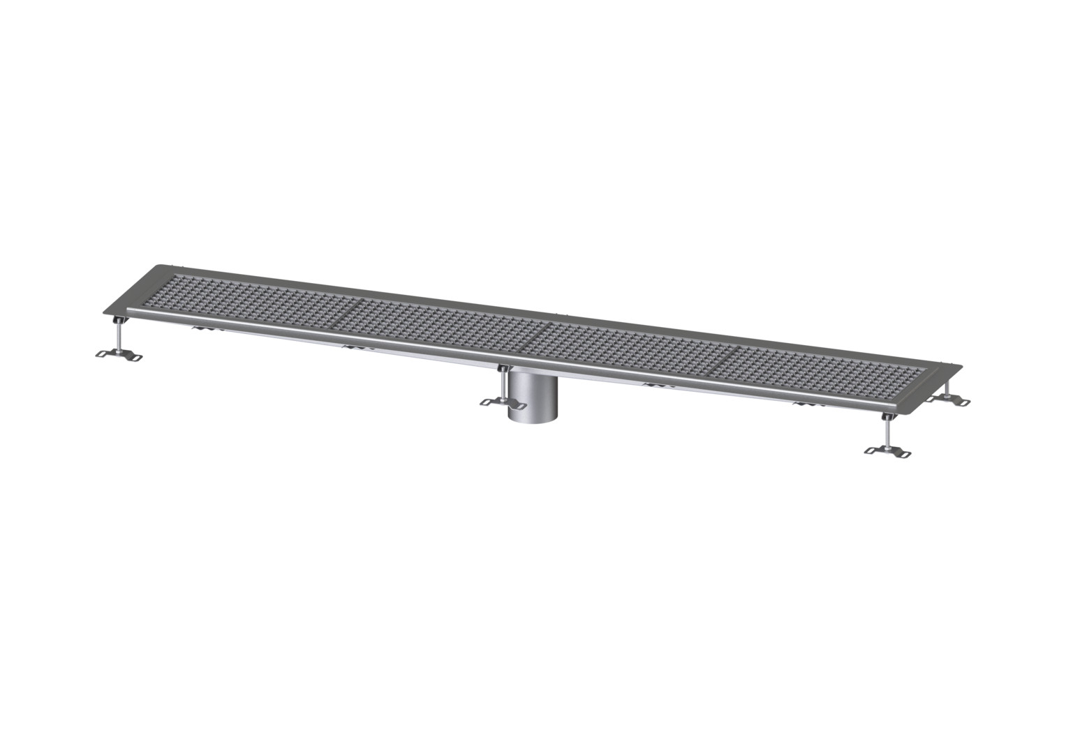zum Einbau in die Bodenplatte, Material Edelstahl 1.4301 (V2A), Materialstärke 1,5 mm, im Tauchbad gebeizt, Sichtstege geschliffen, Längs- und Quergefälle, Standfüße zur Höhennivellierung, Auslaufstutzen aus Edelstahl, Rinnenprofil in Anbindung an Bodenbeschichtungen (z. B. Epoxidharze), mit Kleberand 6 mm tief und 50 mm nach außen angekantet, umlaufend, mit verschweißten Gehrungen, Abdeckung Gitterrost aus Edelstahl, rutschhemmend R12, im Tauchbad gebeizt, Maschenweite 23 x 23 mm, Belastungsklasse L 15 (1,5 t), optionales Zubehör passende Ablaufgrundkörper System 125, Variofix Ablaufstutzen aus Edelstahl, bis 5 mm radial verschiebbar