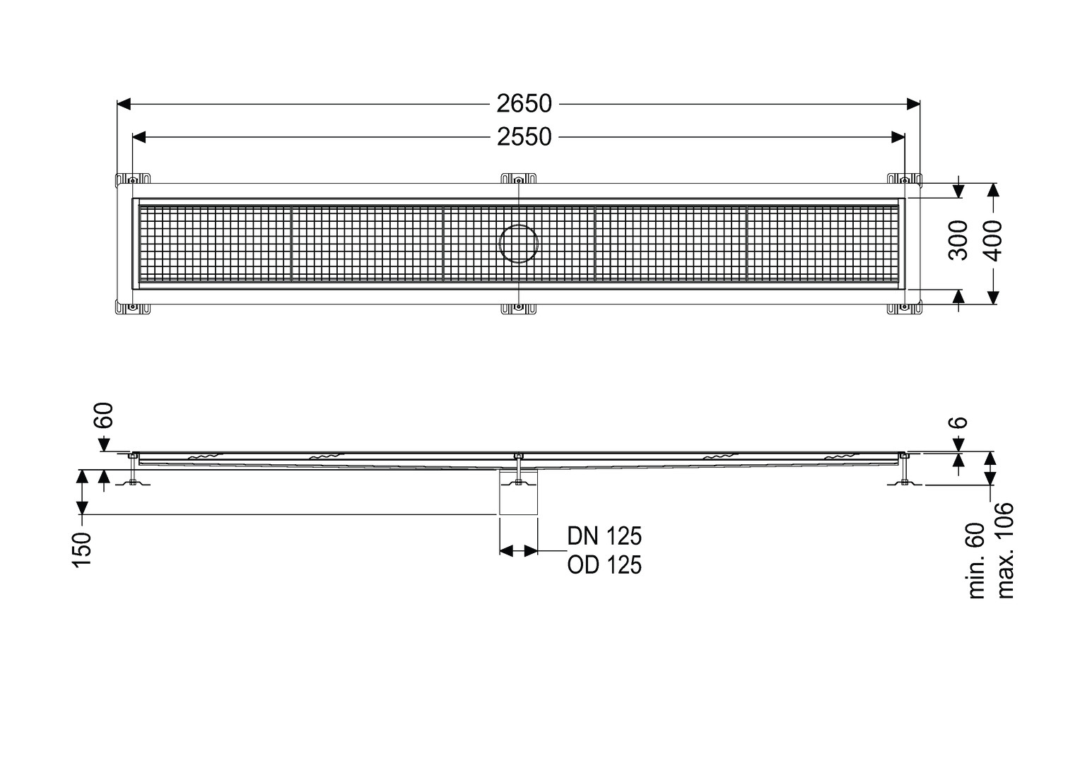zum Einbau in die Bodenplatte, Material Edelstahl 1.4301 (V2A), Materialstärke 1,5 mm, im Tauchbad gebeizt, Sichtstege geschliffen, Längs- und Quergefälle, Standfüße zur Höhennivellierung, Auslaufstutzen aus Edelstahl, Rinnenprofil in Anbindung an Bodenbeschichtungen (z. B. Epoxidharze), mit Kleberand 6 mm tief und 50 mm nach außen angekantet, umlaufend, mit verschweißten Gehrungen, Abdeckung Gitterrost aus Edelstahl, rutschhemmend R12, im Tauchbad gebeizt, Maschenweite 23 x 23 mm, Belastungsklasse L 15 (1,5 t), optionales Zubehör passende Ablaufgrundkörper System 125, Variofix Ablaufstutzen aus Edelstahl, bis 5 mm radial verschiebbar