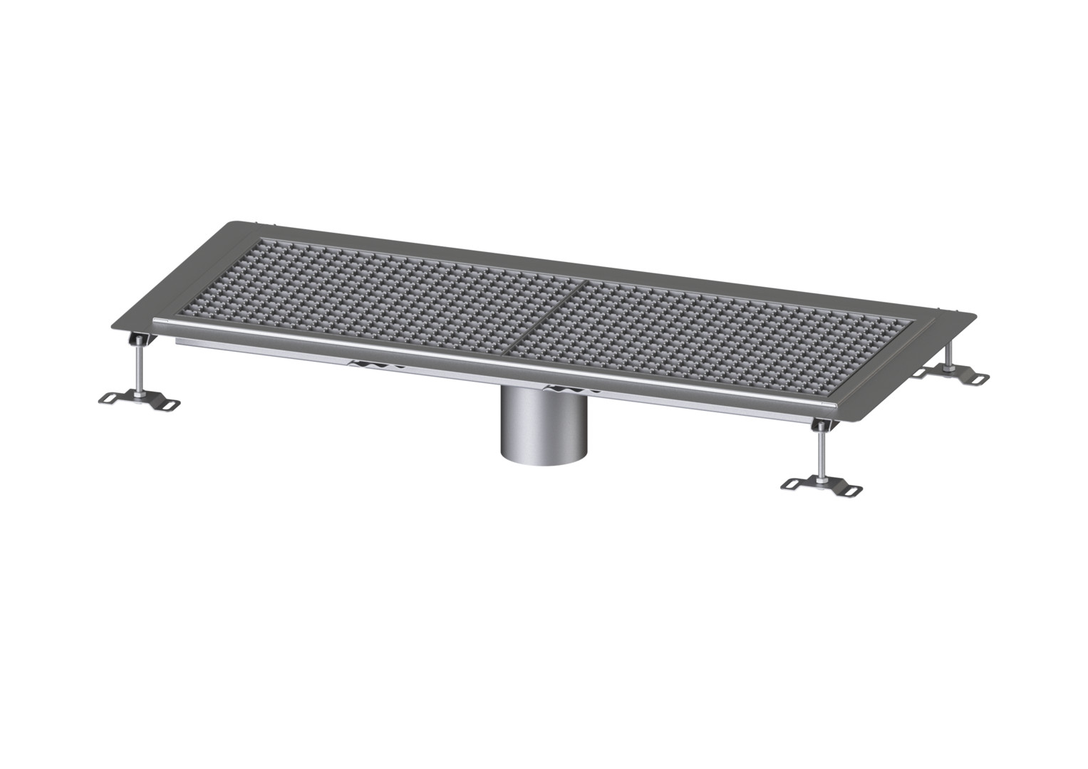 zum Einbau in die Bodenplatte, Material Edelstahl 1.4301 (V2A), Materialstärke 1,5 mm, im Tauchbad gebeizt, Sichtstege geschliffen, Längs- und Quergefälle, Standfüße zur Höhennivellierung, Auslaufstutzen aus Edelstahl, Rinnenprofil in Anbindung an Bodenbeschichtungen (z. B. Epoxidharze), mit Kleberand 6 mm tief und 50 mm nach außen angekantet, umlaufend, mit verschweißten Gehrungen, Abdeckung Gitterrost aus Edelstahl, rutschhemmend R12, im Tauchbad gebeizt, Maschenweite 23 x 23 mm, Belastungsklasse L 15 (1,5 t), optionales Zubehör passende Ablaufgrundkörper System 125, Variofix Ablaufstutzen aus Edelstahl, bis 5 mm radial verschiebbar