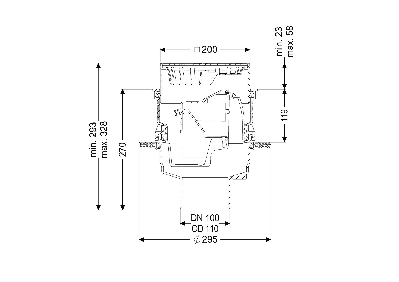 Auslauf senkrecht, werkseitig montierter Flansch für den Einbau in WU-Beton, druckwasserdicht bis 0,6 bar sowie radondicht, Geruchsverschluss, Schlammeimer, Abdeckung Schlitzrost aus Kunststoff, Klasse K 3, Schlitzrost und Rahmen aus Edelstahl V2A, verschraubt, Klasse 3, Sperrwasserhöhe 60 mm, Abflussleistung 2,5 l/s, Aussparungsmaße 310 × 310 mm, Einbautiefe 293-350/293-340 mm
