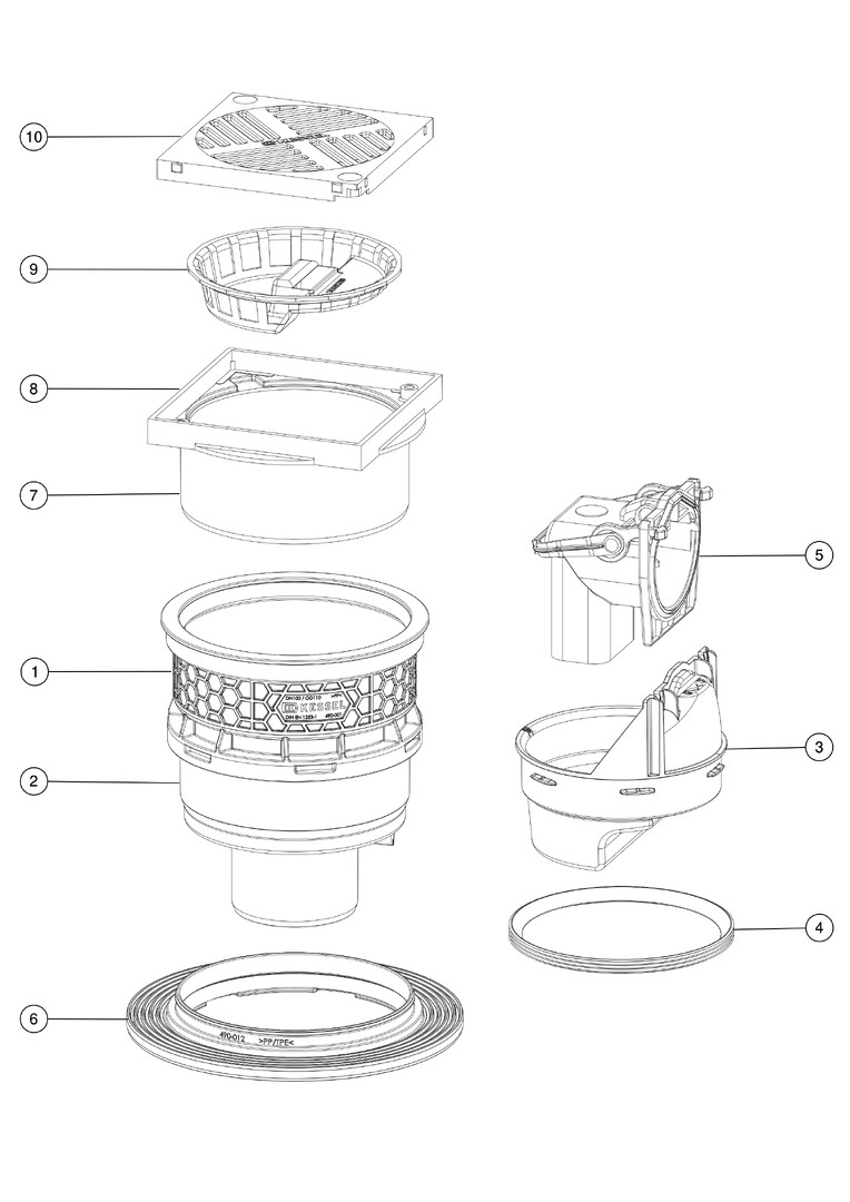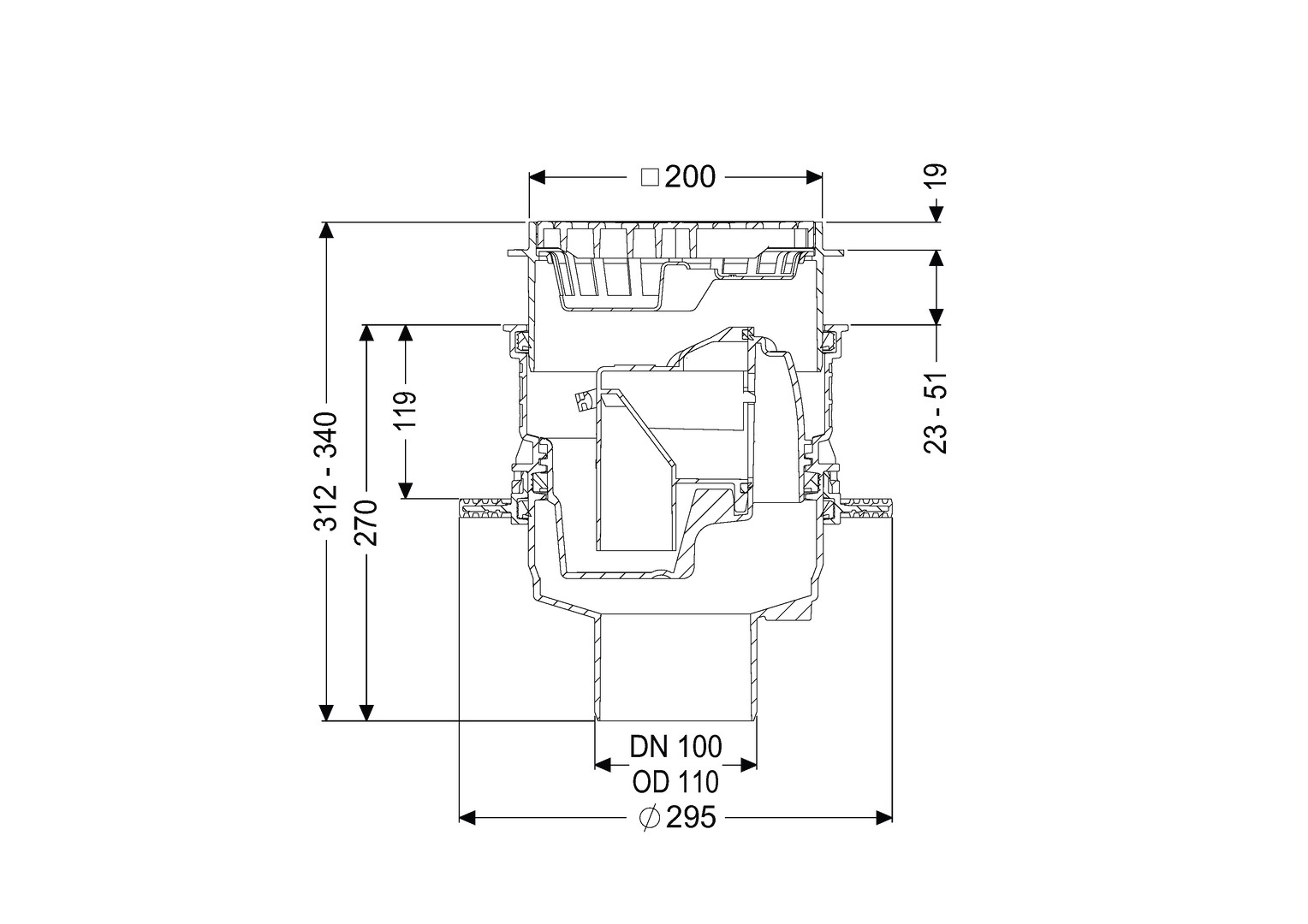 Auslauf senkrecht, werkseitig montierter Flansch für den Einbau in WU-Beton, druckwasserdicht bis 0,6 bar sowie radondicht, Geruchsverschluss, Schlammeimer, Abdeckung Schlitzrost aus Kunststoff, Klasse K 3, Schlitzrost und Rahmen aus Edelstahl V2A, verschraubt, Klasse 3, Sperrwasserhöhe 60 mm, Abflussleistung 2,5 l/s, Aussparungsmaße 310 × 310 mm, Einbautiefe 293-350/293-340 mm