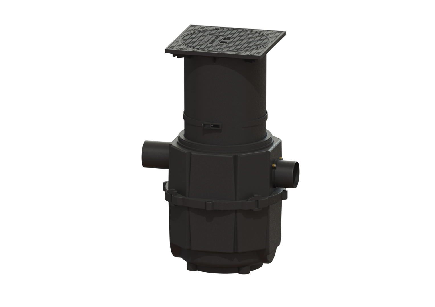zum Einbau ins Erdreich, aus Kunststoff, mit Schlammfang, teleskopisch höhenverstellbares Aufsatzstück aus Kunststoff, selbsttätige Verschlusseinrichtung, Zu- und Auslauf DN 100, optional Rückstauverschluss nach DIN 13564, automatisches Messgerät SonicControl kann nicht verbaut werden, Zubehör Probenahmeeinrichtung zum Erdeinbau, Pumpstation