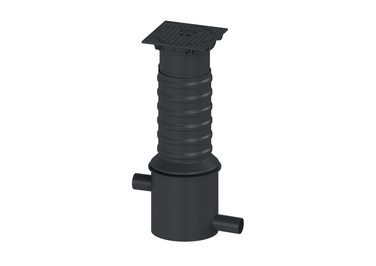 aus Kunststoff, zum Einbau ins Erdreich, zum Anschluss an die Ableitung von Abscheideranlagen, leerlaufend, Einbautiefe 950-1300 mm, Absturzhöhe 160 mm nach DIN, teleskopisch höhenverstellbares Aufsatzstück mit Klemmring, geruchsdicht verschlossen, ohne Aushebeschlüssel, Aufstockung 600 mm, mit Verlängerungsstück Artikel 915 402, reduzierter Sohlsprung von 30-160 mm auf Anfrage