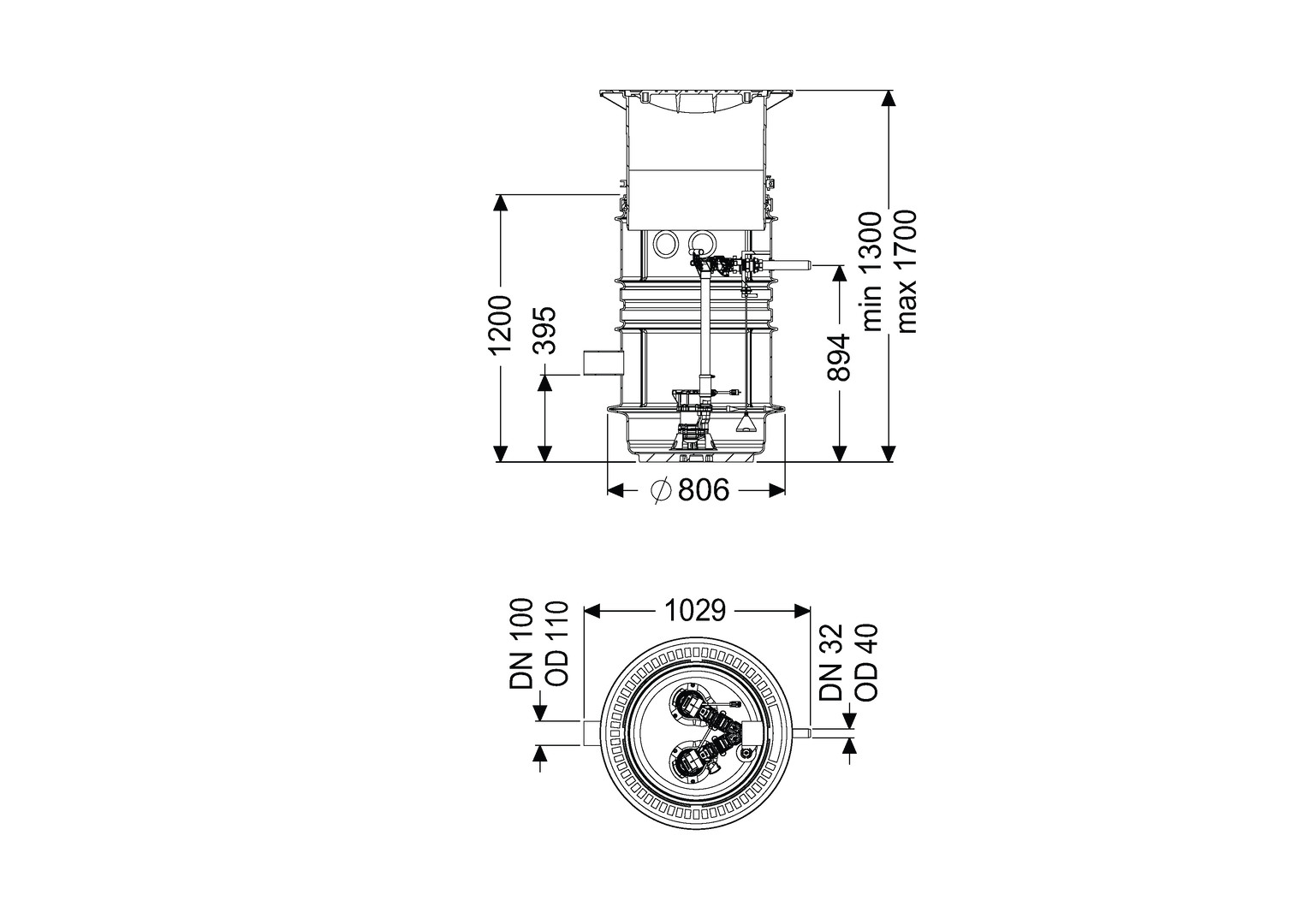 mit pneumatischer Niveauerfassung, zum Einbau ins Erdreich für Schmutz- und Regenwasser, Schachtsystem LW 600 aus PE-LLD, Pumpe mit Freistromrad, Einbau beständig bei Einbau ins Grundwasser bis 2500 mm, Pumpstation Aquapump im Schachtsystem LW 600, Zulauf DN 100 (GTF 600), Zulauf DN 150 (GTF 1200), Druckabgang DN 32 (OD 40) aus PVC, Abdeckung nach DIN EN 124 aus Beton/Guss, Klasse A/B, Kabellänge 10 m
