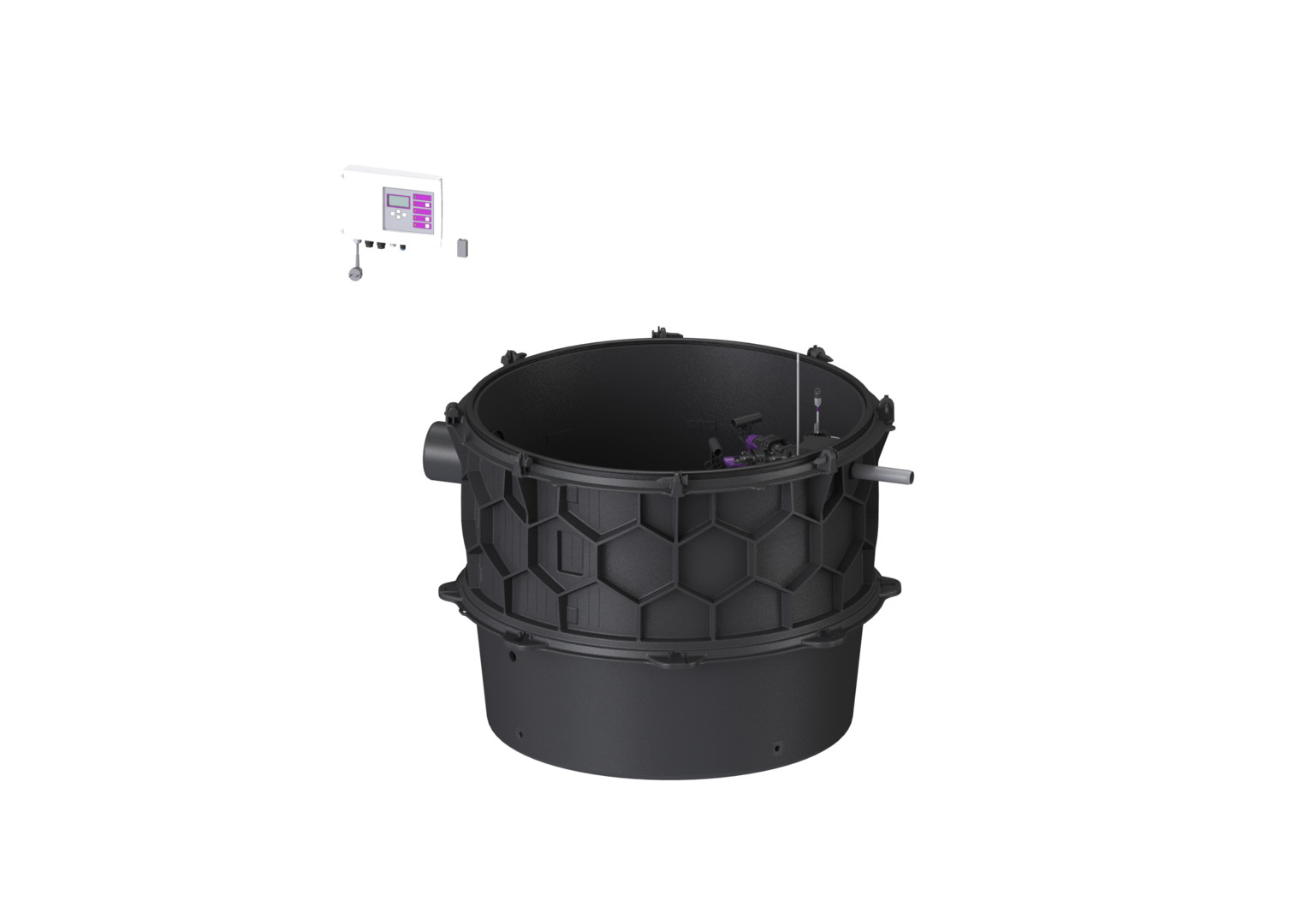mit pneumatischer Niveauerfassung (mit Tauchglocke), Nassaufstellung, zum Einbau ins Erdreich oder in eine Bodenplatte, für fäkalienfreies Abwasser, Bodenteil sowie Zu- und Auslauf aus PE, Pumpe mit Freistromrad, Einbau in Kombination mit Technikschacht-Modul, beständig bei Einbau ins Grundwasser bis 3000 mm, mit Pumpstation Aquapump XL Duo, aufgeschweißten Schachtring, Behältervolumen ca 680 l, Zulauf DN 150, Druckabgang DN 32, Rückflussverhinderer, Kabellänge 10 m (30 m auf Anfrage)