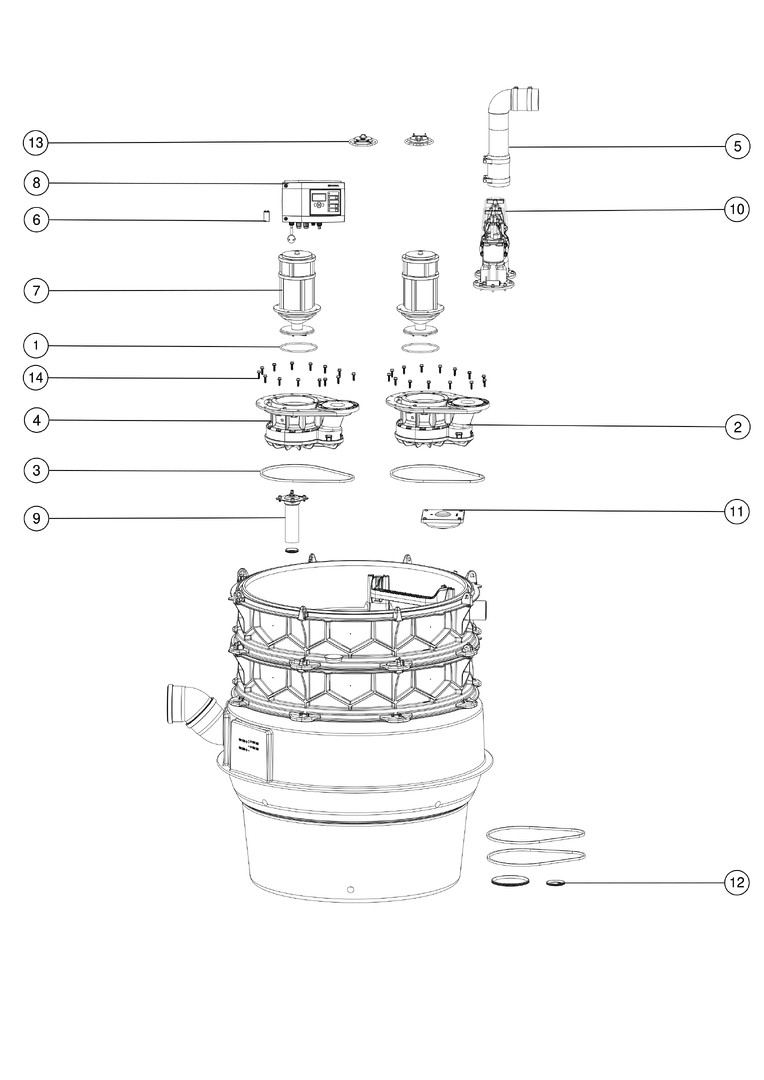 Trockenaufstellung, zum Einbau ins Erdreich oder in eine Bodenplatte, für fäkalienhaltiges Abwasser, Bodenteil aus PE, Pumpe mit Freistromrad, Einbau in Kombination mit Technikschacht-Modul, beständig bei Einbau ins Grundwasser bis 3000 mm, die Druckleitung ist als geschweißtes PE-Rohr oder als Klemmverbindung auszuführen, mit Pumpstation Aquapump XL Duo, 230 V-Versionen steckerfertig, aufgeschweißten Schachtring, Behältervolumen ca. 335 l, max. Nutzvolumen ca. 160 l, Zulauf DN 150, Druckabgang DN 80, Rückflussverhinderer, Absperreinrichtungen auf Druckleitungsseite, Kabellänge 10 m