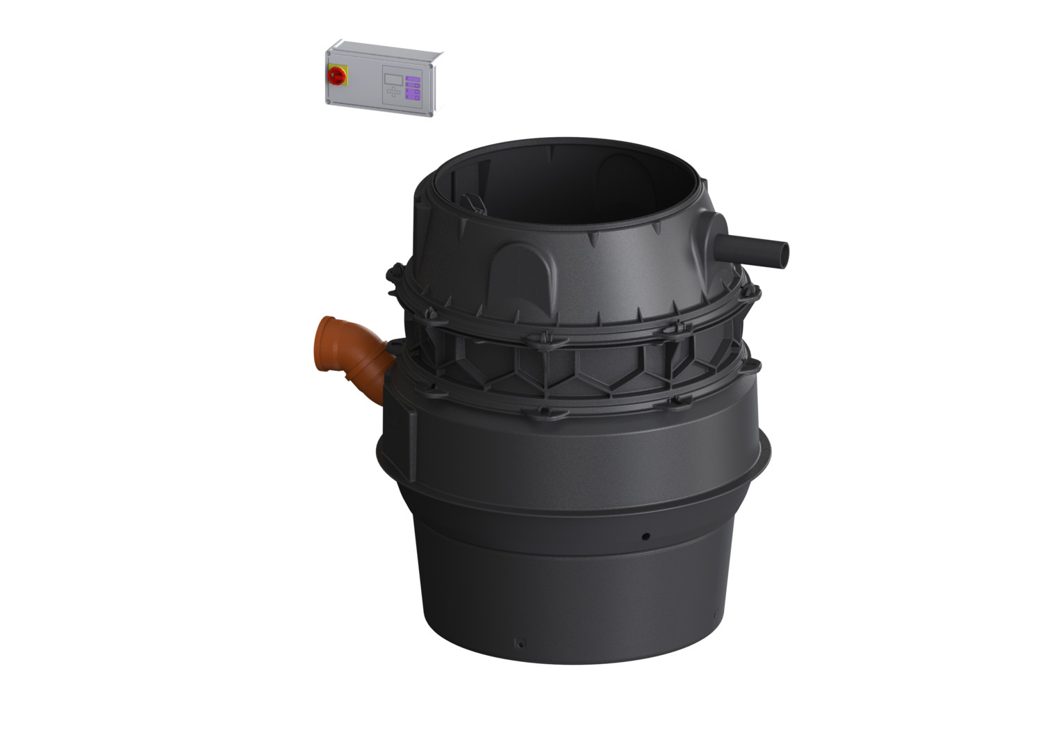 Trockenaufstellung, Variante für niedrigsten Einbau, für fäkalienhaltiges Abwasser, Bodenteil aus PE, Pumpe mit Freistromrad, Einbau in Kombination mit Aufsatzstück LW 800 zum Einbau ins Erdreich oder in eine Bodenplatte, beständig bei Einbau ins Grundwasser bis 3000 mm, die Druckleitung ist als geschweißtes PE-Rohr oder als Klemmverbindung auszuführen, mit Pumpstation Aquapump XL Duo, 230 V-Versionen steckerfertig, aufgeschweißten Konus LW 800, Behältervolumen ca. 335 l, max. Nutzvolumen ca. 160 l, Zulauf DN 150, Druckabgang DN 80, Rückflussverhinderer, Absperreinrichtungen auf Druckleitungsseite, Kabellänge 10 m
