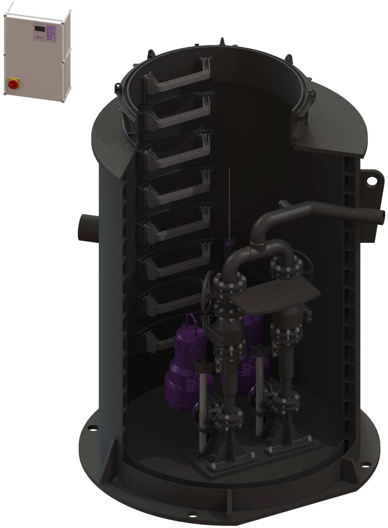 Nassaufstellung, zum Einbau ins Erdreich, für fäkalienhaltiges Abwasser, Bodenteil sowie Zu- und Auslauf aus PE, Wickelschacht, Einbau in Kombination mit Technikschacht-Modul, beständig bei Einbau ins Grundwasser bis 3000 mm, die Druckleitung ist als geschweißtes PE-Rohr auszuführen, mit Pumpstation Aquapump XXL Duo, aufgeschweißten Schachtring, Behältervolumen ca. 1800 l, max. Nutzvolumen ca. 800 l, Zulauf DN 150, Druckabgang DN 80, Kabellänge 10 m (30 m auf Anfrage)