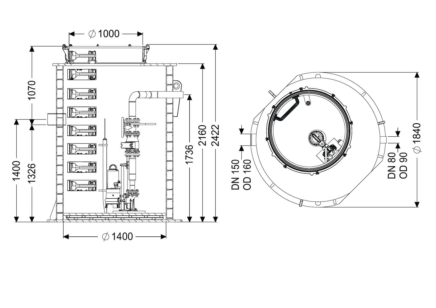 Nassaufstellung, zum Einbau ins Erdreich, für fäkalienhaltiges Abwasser, Bodenteil sowie Zu- und Auslauf aus PE, Wickelschacht, Einbau in Kombination mit Technikschacht-Modul (z. B. hinter Abscheideanlagen), beständig bei Einbau ins Grundwasser bis 3000 mm, die Druckleitung ist als geschweißtes PE-Rohr auszuführen, mit Pumpstation Aquapump XXL Mono, aufgeschweißten Schachtring, Behältervolumen ca. 1800 l, Zulauf DN 150, Druckabgang DN 80, Kabellänge 10 m (30 m auf Anfrage)
