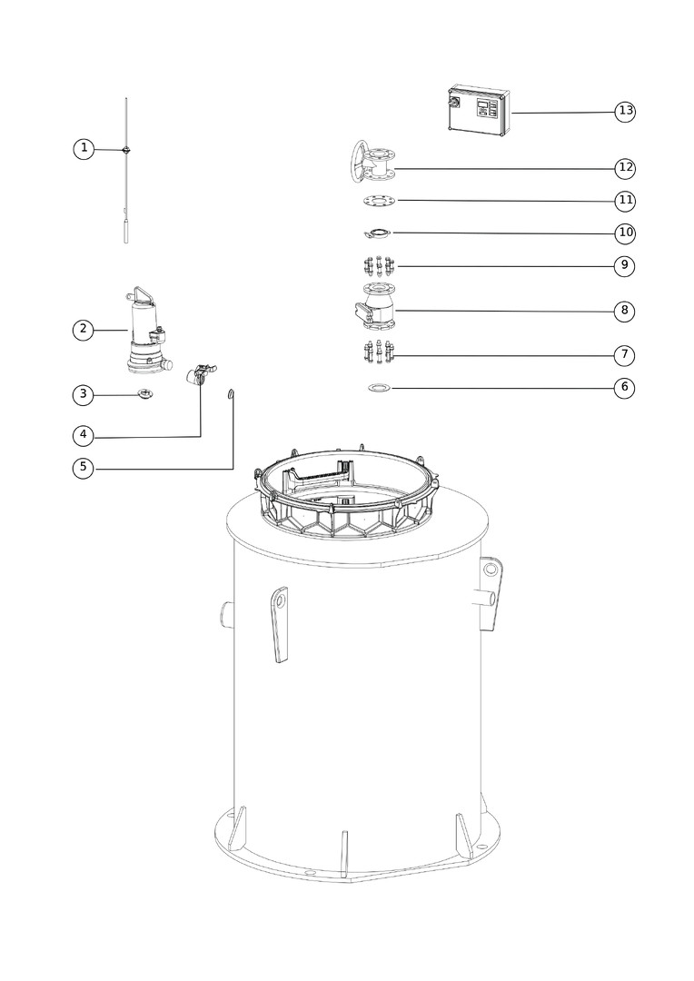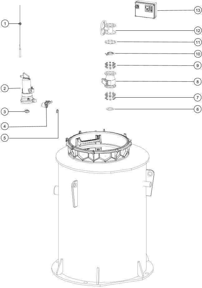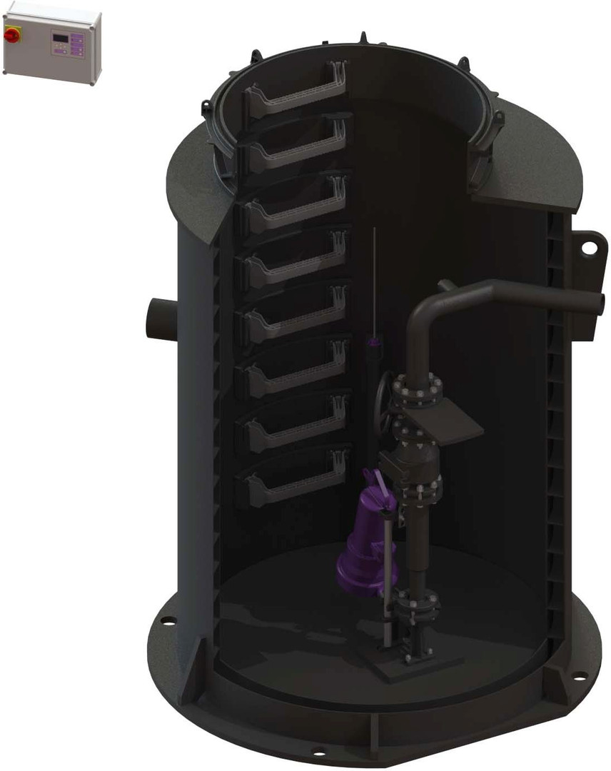Nassaufstellung, zum Einbau ins Erdreich, für fäkalienhaltiges Abwasser, Bodenteil sowie Zu- und Auslauf aus PE, Wickelschacht, Einbau in Kombination mit Technikschacht-Modul, beständig bei Einbau ins Grundwasser bis 3000 mm, die Druckleitung ist als geschweißtes PE-Rohr auszuführen, mit Pumpstation Aquapump XXL Mono, aufgeschweißten Schachtring, Behältervolumen ca. 1800 l, max. Nutzvolumen ca. 900 l, Zulauf DN 150, Druckabgang DN 80, Kabellänge 10 m (30 m auf Anfrage)