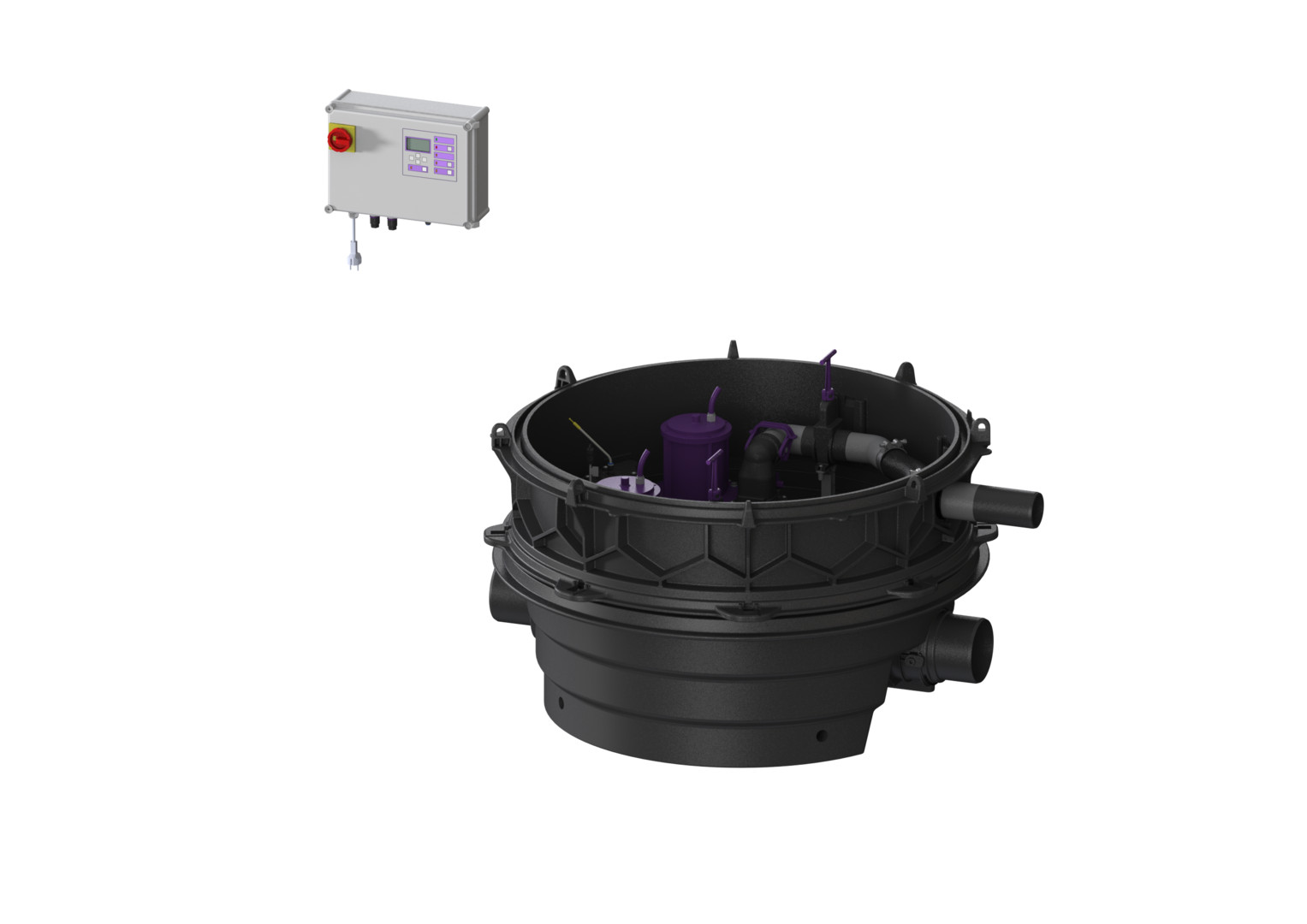 Trockenaufstellung, für fäkalienhaltiges Abwasser, Bodenteil aus PE, für Einbau in frostgeschützten Räumen (frei aufgestellt) oder in Kombination mit Technikschacht-Modul, zum Einbau ins Erdreich, beständig bei Einbau ins Grundwasser bis 3000 mm, die Druckleitung ist als geschweißtes PE-Rohr, bei Pumpe SPF 4500 zusätzlich in einem Druckentspannungsschacht auszuführen, Rückstauhebeanlage Ecolift XL Duo, Zulauf/Auslauf DN 150, mit Comfort Plus-Schaltgerät, mit einem motorischen Verschluss für Schwarzwasser, 230 V-Versionen steckerfertig, Kabellänge 10 m