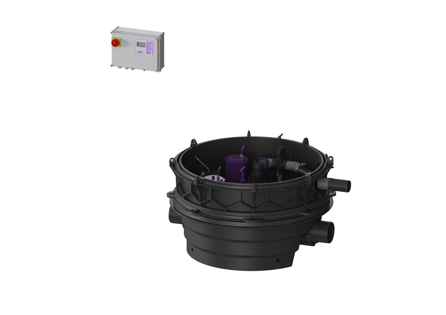Trockenaufstellung, für fäkalienhaltiges Abwasser, Bodenteil aus PE, für Einbau in frostgeschützten Räumen (frei aufgestellt) oder in Kombination mit Technikschacht-Modul, zum Einbau ins Erdreich, beständig bei Einbau ins Grundwasser bis 3000 mm, die Druckleitung ist als geschweißtes PE-Rohr, bei Pumpe SPF 4500 zusätzlich in einem Druckentspannungsschacht auszuführen, Rückstauhebeanlage Ecolift XL Duo, Zulauf/Auslauf DN 150, mit Comfort Plus-Schaltgerät, mit einem motorischen Verschluss für Schwarzwasser, 230 V-Versionen steckerfertig, Kabellänge 10 m