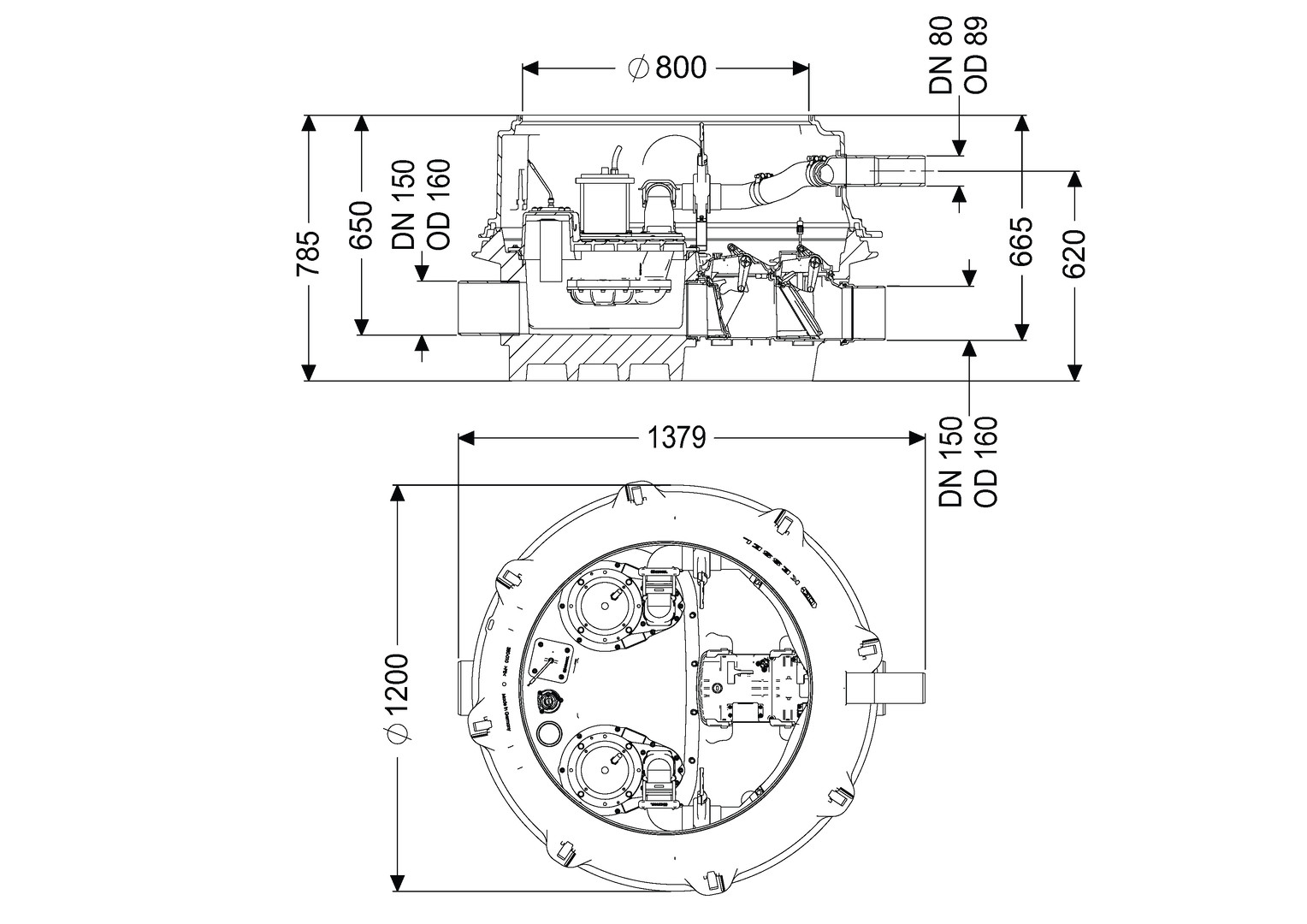 Trockenaufstellung, Variante für niedrigsten Einbau, für fäkalienhaltiges Abwasser, Bodenteil aus PE, für Einbau in frostgeschützten Räumen (frei aufgestellt) oder in Kombination mit Aufsatzstück LW 800 zum Einbau ins Erdreich oder in eine Bodenplatte, beständig bei Einbau ins Grundwasser bis 3000 mm, die Druckleitung ist als geschweißtes PE-Rohr, bei Pumpe SPF 4500 zusätzlich in einem Druckentspannungsschacht auszuführen, Rückstauhebeanlage Ecolift XL Duo mit aufgeschweißtem Konus LW 800, Zulauf/Auslauf DN 150, mit Comfort Plus-Schaltgerät, mit einem motorischen Verschlusssystem für Schwarzwasser, 230 V-Versionen steckerfertig, Kabellänge 10 m