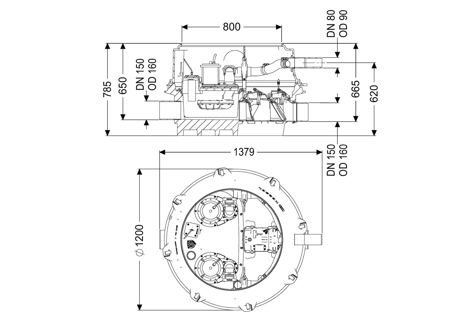 Trockenaufstellung, Variante für niedrigsten Einbau, für fäkalienhaltiges Abwasser, Bodenteil aus PE, für Einbau in frostgeschützten Räumen (frei aufgestellt) oder in Kombination mit Aufsatzstück LW 800 zum Einbau ins Erdreich oder in eine Bodenplatte, beständig bei Einbau ins Grundwasser bis 3000 mm, die Druckleitung ist als geschweißtes PE-Rohr, bei Pumpe SPF 4500 zusätzlich in einem Druckentspannungsschacht auszuführen, Rückstauhebeanlage Ecolift XL Duo mit aufgeschweißtem Konus LW 800, Zulauf/Auslauf DN 150, mit Comfort Plus-Schaltgerät, mit einem motorischen Verschlusssystem für Schwarzwasser, 230 V-Versionen steckerfertig, Kabellänge 10 m