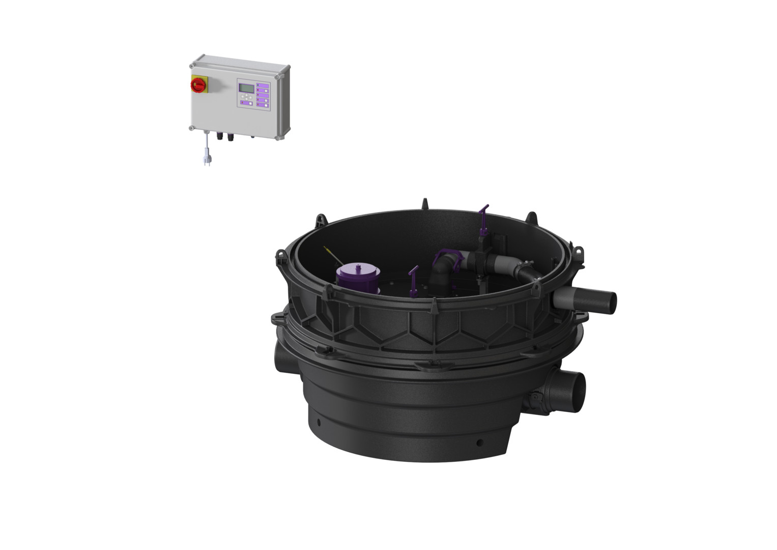 Trockenaufstellung, für fäkalienhaltiges Abwasser, Bodenteil aus PE, für Einbau in frostgeschützten Räumen (frei aufgestellt) oder in Kombination mit Technikschacht-Modul, zum Einbau ins Erdreich, beständig bei Einbau ins Grundwasser bis 3000 mm, die Druckleitung ist als geschweißtes PE-Rohr, bei Pumpe SPF 4500 zusätzlich in einem Druckentspannungsschacht auszuführen, Rückstauhebeanlage Ecolift XL Mono, Zulauf/Auslauf DN 150, mit Comfort Plus-Schaltgerät, mit einem motorischen Verschluss für Schwarzwasser, 230 V-Versionen steckerfertig, Kabellänge 10 m
