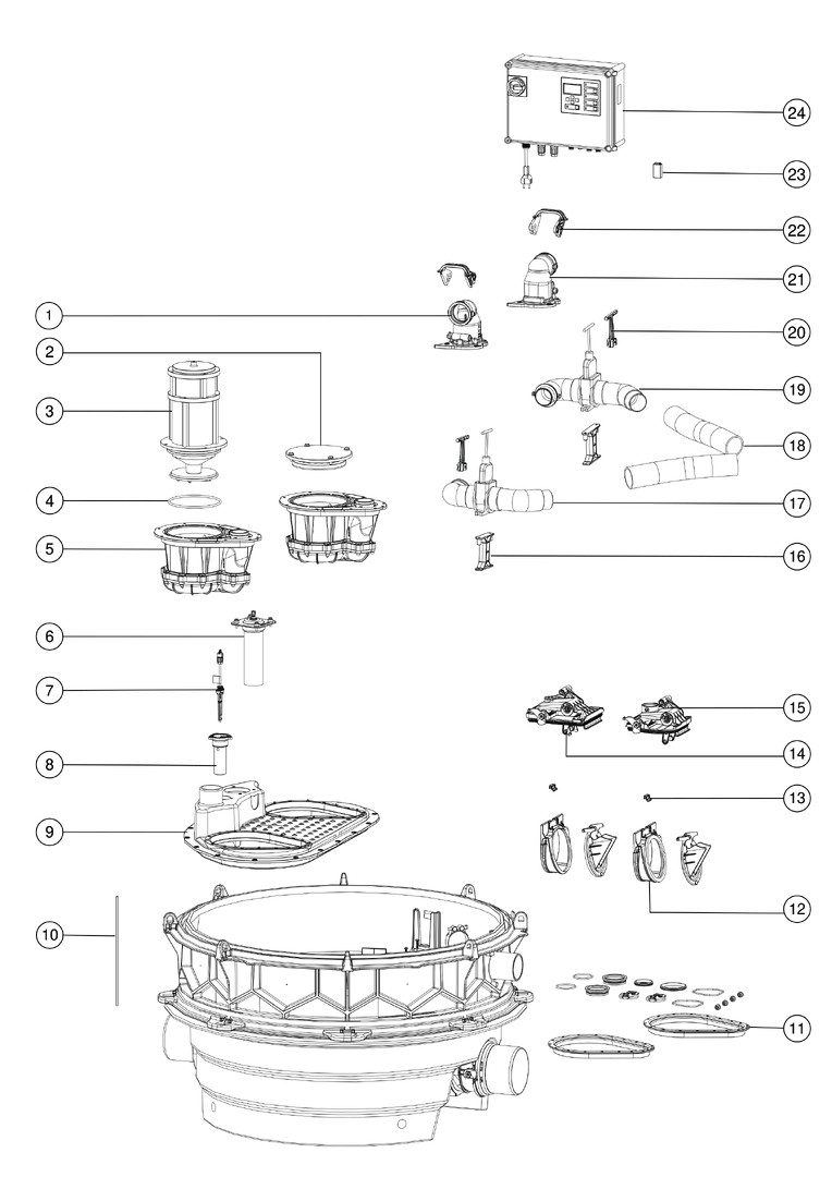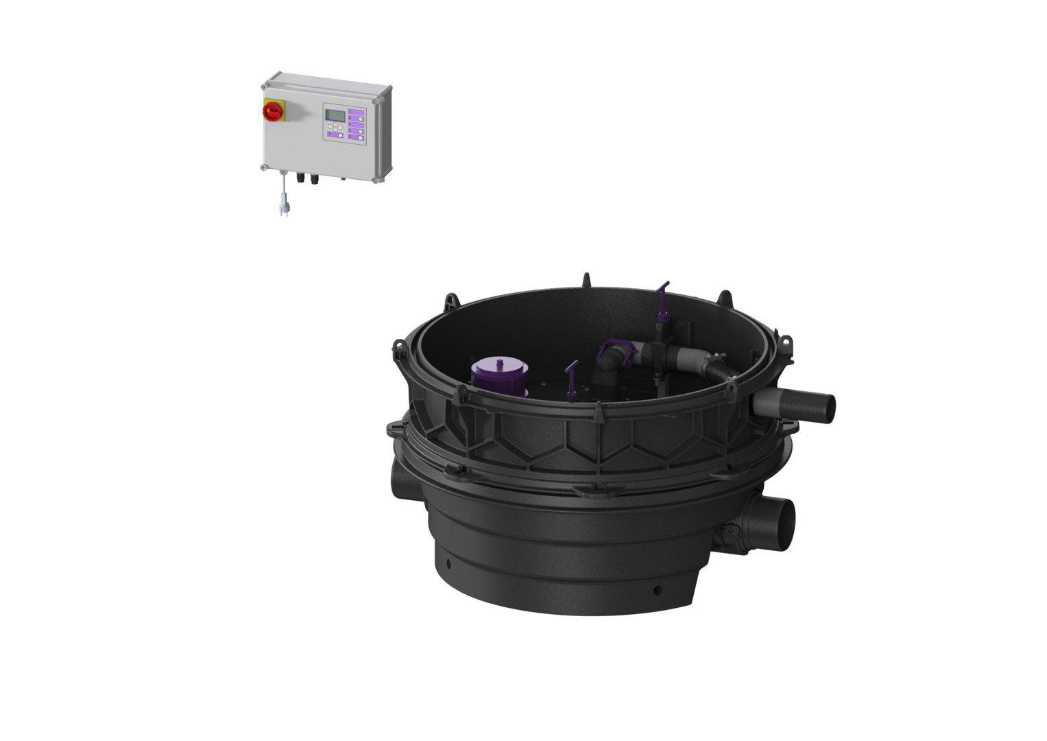 Trockenaufstellung, für fäkalienhaltiges Abwasser, Bodenteil aus PE, für Einbau in frostgeschützten Räumen (frei aufgestellt) oder in Kombination mit Technikschacht-Modul, zum Einbau ins Erdreich, beständig bei Einbau ins Grundwasser bis 3000 mm, die Druckleitung ist als geschweißtes PE-Rohr, bei Pumpe SPF 4500 zusätzlich in einem Druckentspannungsschacht auszuführen, Rückstauhebeanlage Ecolift XL Mono, Zulauf/Auslauf DN 150, mit Comfort Plus-Schaltgerät, mit zwei mechanischen Klappen für Grauwasser, 230 V-Versionen steckerfertig, Kabellänge 10 m