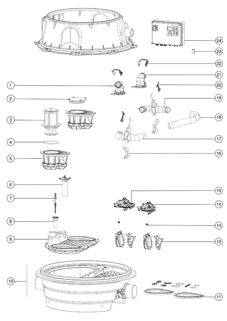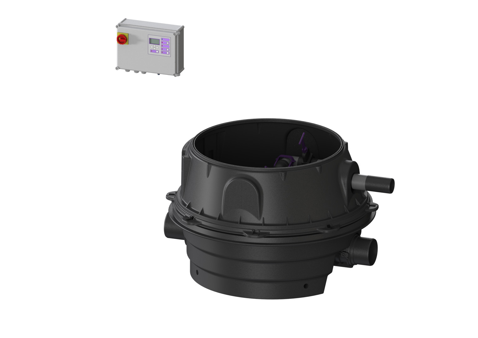 Trockenaufstellung, Variante für niedrigsten Einbau, für fäkalienhaltiges Abwasser, Bodenteil aus PE, für Einbau in frostgeschützten Räumen (frei aufgestellt) oder in Kombination mit Aufsatzstück LW 800 zum Einbau ins Erdreich oder in eine Bodenplatte, beständig bei Einbau ins Grundwasser bis 3000 mm, die Druckleitung ist als geschweißtes PE-Rohr, bei Pumpe SPF 4500 zusätzlich in einem Druckentspannungsschacht auszuführen, Rückstauhebeanlage Ecolift XL Mono mit aufgeschweißtem Konus LW 800, Zulauf/Auslauf DN 150, mit Comfort Plus-Schaltgerät, mit zwei mechanischen Klappen für Grauwasser, 230 V-Versionen steckerfertig, Kabellänge 10 m