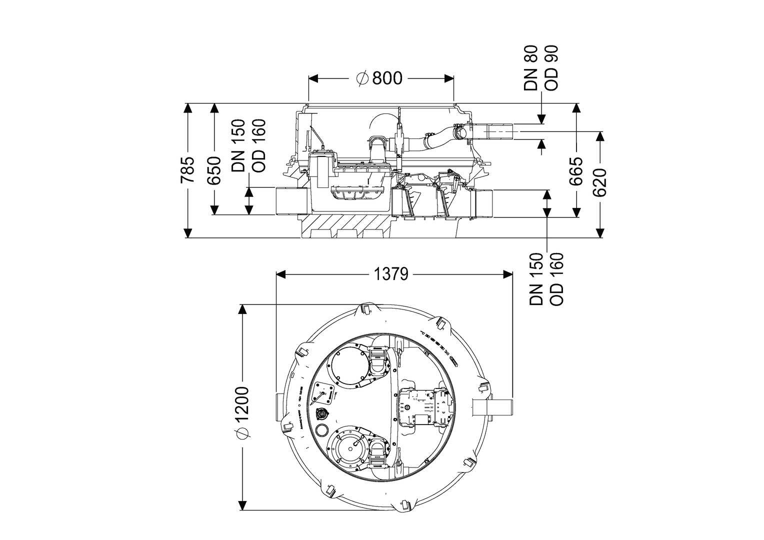 Trockenaufstellung, Variante für niedrigsten Einbau, für fäkalienhaltiges Abwasser, Bodenteil aus PE, für Einbau in frostgeschützten Räumen (frei aufgestellt) oder in Kombination mit Aufsatzstück LW 800 zum Einbau ins Erdreich oder in eine Bodenplatte, beständig bei Einbau ins Grundwasser bis 3000 mm, die Druckleitung ist als geschweißtes PE-Rohr, bei Pumpe SPF 4500 zusätzlich in einem Druckentspannungsschacht auszuführen, Rückstauhebeanlage Ecolift XL Mono mit aufgeschweißtem Konus LW 800, Zulauf/Auslauf DN 150, mit Comfort Plus-Schaltgerät, mit zwei mechanischen Klappen für Grauwasser, 230 V-Versionen steckerfertig, Kabellänge 10 m