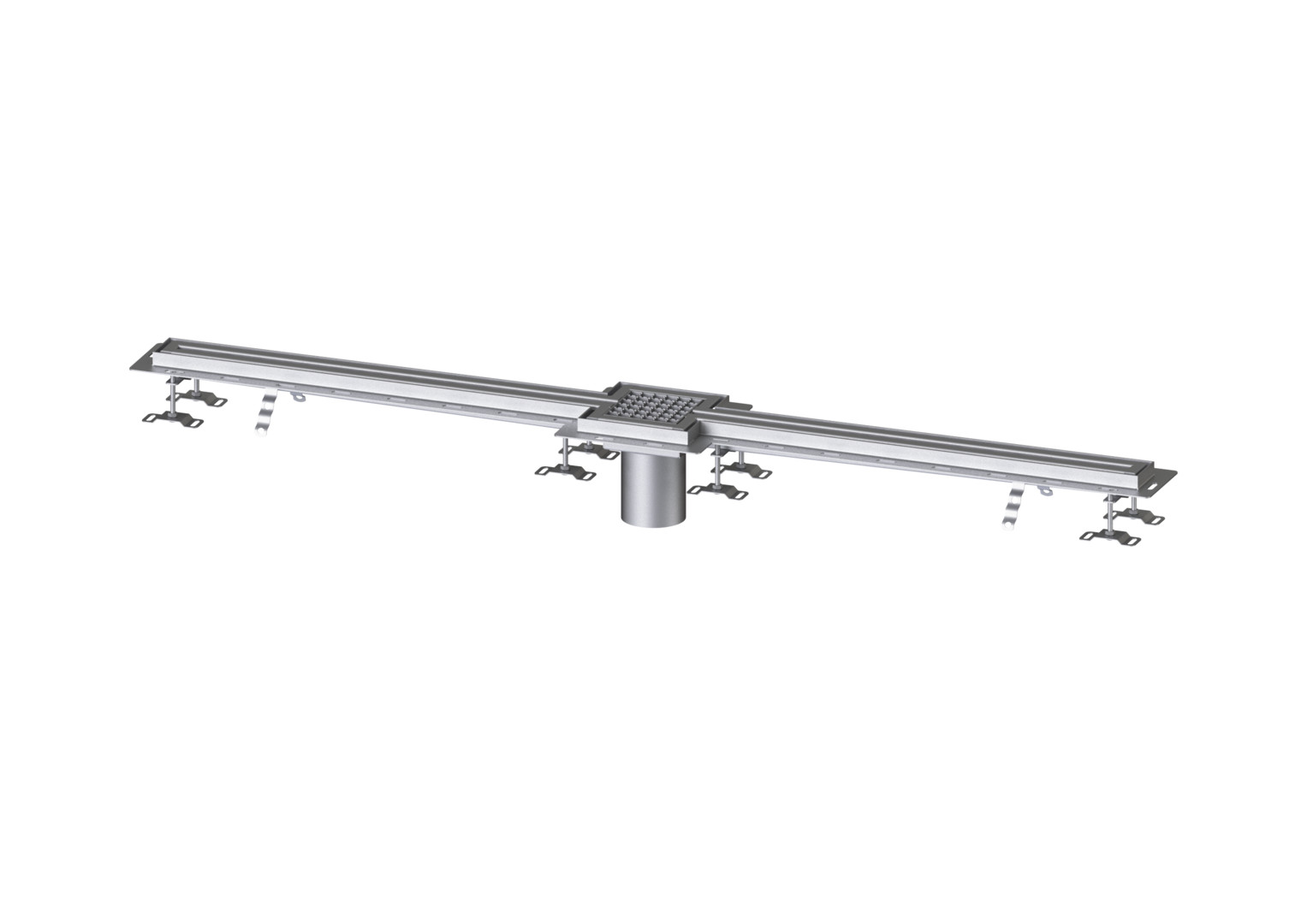 zum Einbau in die Bodenplatte, Material Edelstahl 1.4301 (V2A), Materialstärke 2 mm, im Tauchbad gebeizt, Sichtstege geschliffen, mit Längs- und Quergefälle, Standfüße zur Höhennivellierung, Auslaufstutzen aus Edelstahl, Rinnenprofil für Anbindung an thermisch besonders hoch belastete Bodenbeläge, mit verschweißten Gehrungen, Belastungsklasse L 15 (1,5 t), optional als Zubehör passende Ablaufgrundkörper System 125, Variofix Ablaufstutzen aus Edelstahl, bis 5 mm radial verschiebbar