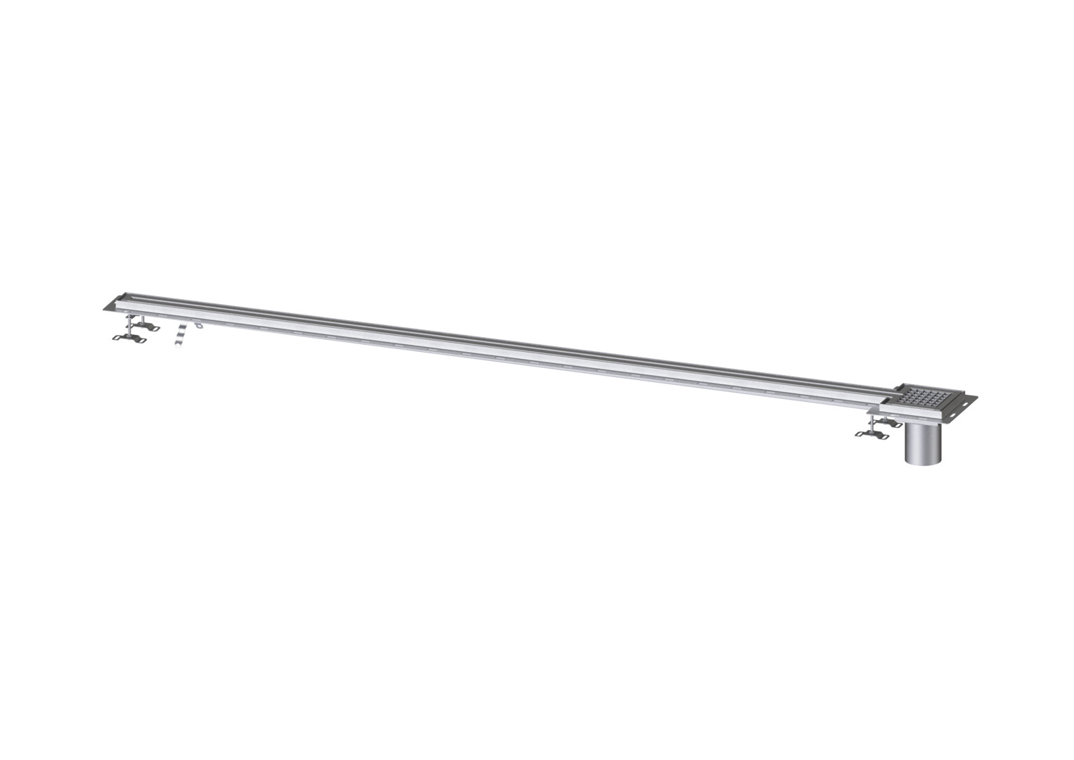 zum Einbau in die Bodenplatte, Material Edelstahl 1.4301 (V2A), Materialstärke 2 mm, im Tauchbad gebeizt, Sichtstege geschliffen, mit Längs- und Quergefälle, Standfüße zur Höhennivellierung, Auslaufstutzen aus Edelstahl, Rinnenprofil für Anbindung an thermisch besonders hoch belastete Bodenbeläge, mit verschweißten Gehrungen, Belastungsklasse L 15 (1,5 t), optional als Zubehör passende Ablaufgrundkörper System 125, Variofix Ablaufstutzen aus Edelstahl, bis 5 mm radial verschiebbar