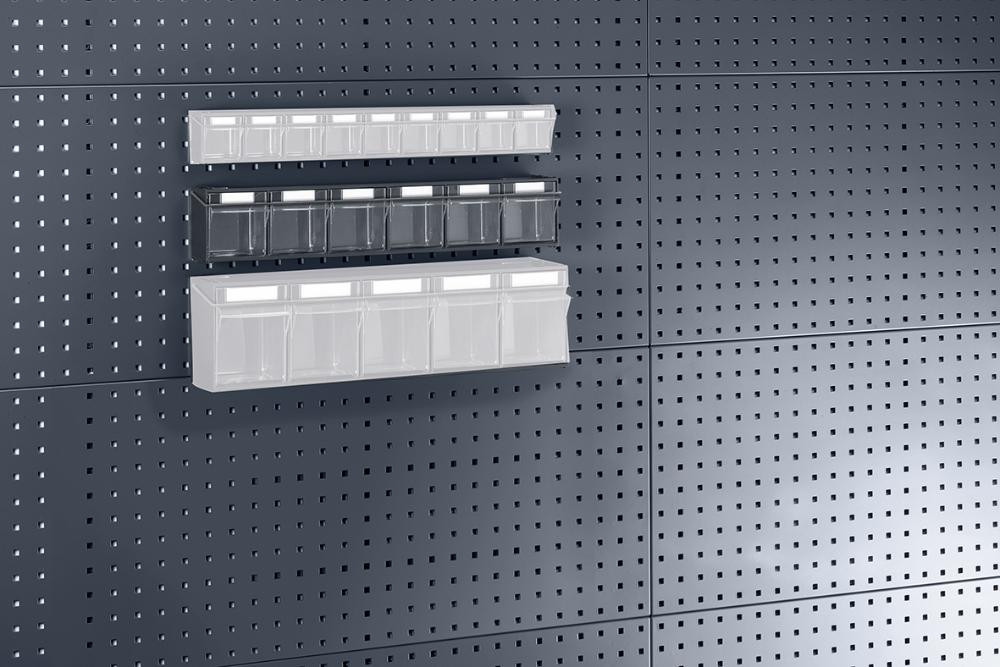 Klarsichtmagazin B600xT96xH112 mm mit 6 Kästen für Lochplatten