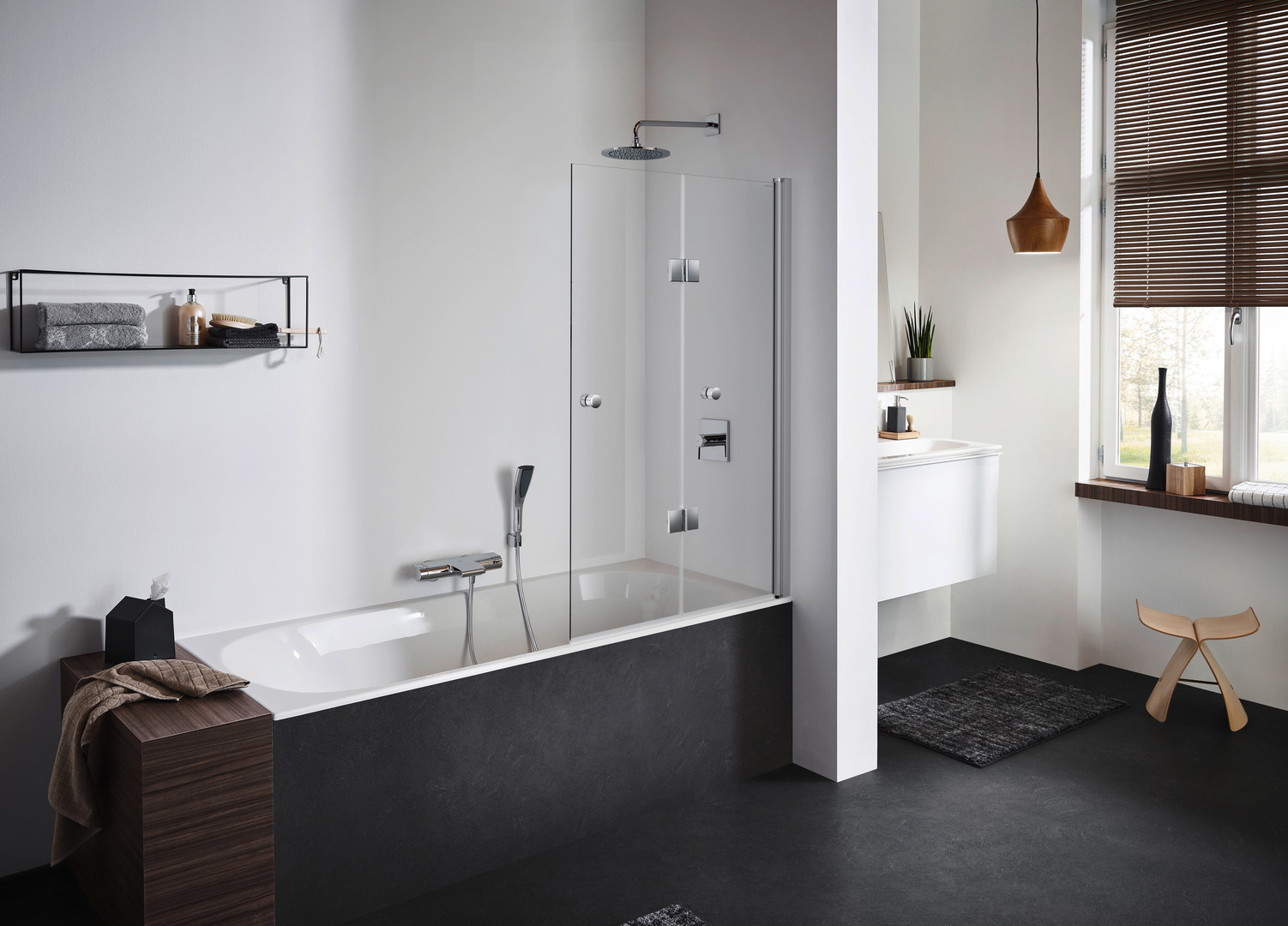 teilgerahmt, 2-teilig mit Faltelementen, Wandanschlag links oder rechts, Profile aus Aluminium, mit Einscheibensicherheitsglas nach DIN EN 12150, optional mit reinigungsfreundlicher GlasPlus-Beschichtung, geeignet für Montage auf Badewanne, Breitenverstellung an einer Seite, an der Wand mit Wandprofil befestigt, Wandprofil mit stufenloser Breitenverstellung und zum Ausgleich von Schrägen, Breitenfixierschrauben mit Abdeckkappen, mit Hebe-/Senkmechanismus, Knaufgriff innen und außen, möglich sind Sondermaß, Schrägzuschnitt, alleinstehend montierbar, Montagezustand teilvormontiert, bestehend aus: eine Falttür bestehend aus zwei Faltelementen, ein Wandprofil, Montageset, Produktdokumentation