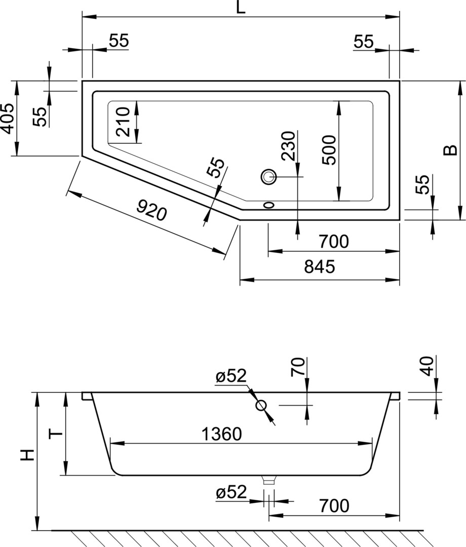 Koralle Raumspar-Badewanne T200 BW 170,6x75,1cm, Überlauf vorne, weiß, gebohrt nach Skizze W209595