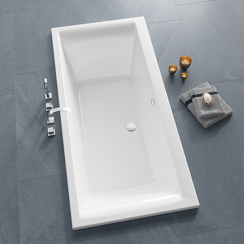 Rechteck-Badewanne, Modelle mit zwei angenehmen Liegeflächen zum entspannten Baden, gegossenes Sanitäracryl, mit Bodenbrettern aus Holz verstärkt, rutschfest und angenehm hautsympatisch, hygienisch, UV-beständig, bruchfest, Oberfläche aus durchgefärbtem Sanitäracryl, kleine Schäden können ausgebessert werden, geringe elektrische Leitfähigkeit, Wannentiefe von 450 mm für entspanntes Baden, Montage durch geringes Eigengewicht