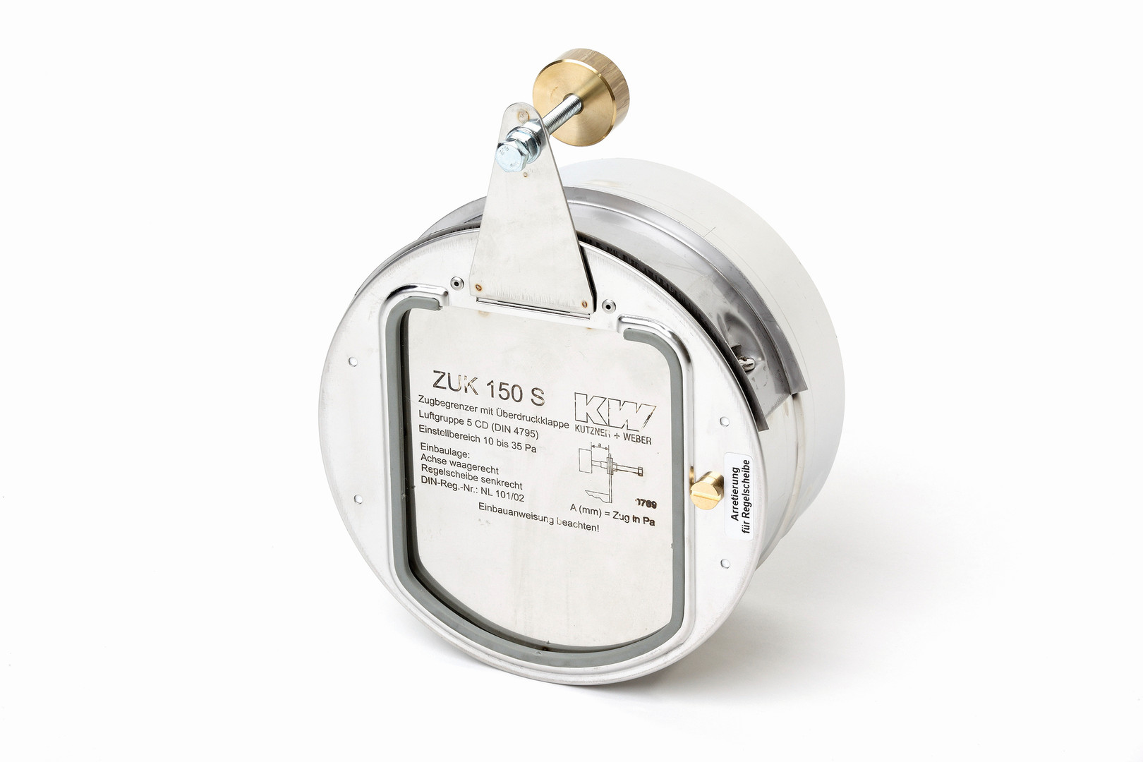 Nebenluftvorrichtung nach DIN 4795 zum Abbau eines zu großen Unterdrucks im Schornstein, Regelscheibe und Gehäuse aus Edelstahl, Einstellgewichte Messing, selbstreinigende Lager, mit Arretierungsmöglichkeit in der Geschlossenstellung, selbstreinigende Lagerung, mit Motorsteuerung zur kombinierten Nebenluftvorrichtung aufrüstbar (nur Z130, Z150-S und Z180), leichtes Einstellen des Zugbedarfs ohne Messung des momentan vorhandenen Schornsteinzuges, ohne Überdruckklappe