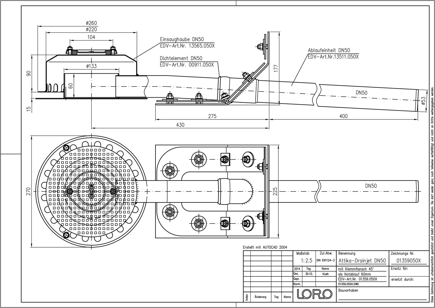 LORO Attika Schnellablauf Serie 62-Drainjet Wehrhöhe 40 mm, DN 50, Klemmflansch 45Grad, für Bitumen-Dachabdichtungsbahnen, Notablauf W558508