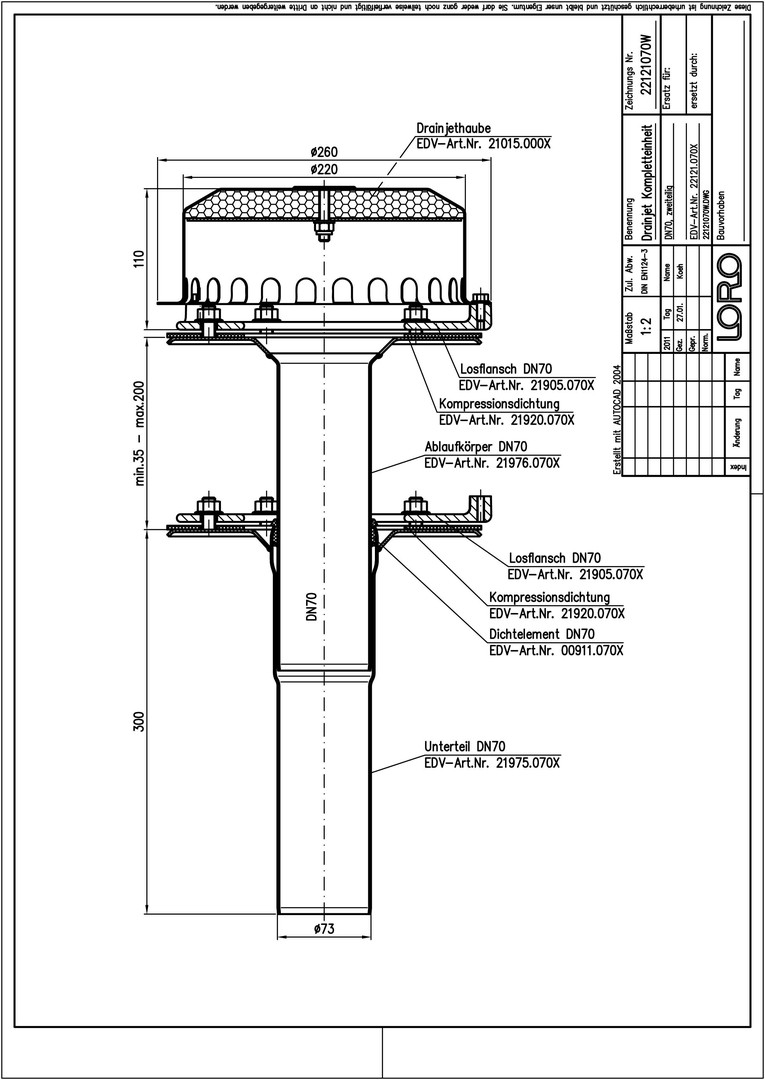 LORO DRAINJET Komplett-Flachdachablauf Serie 49 DN 70, Brandschutz bauseitig, Klemmflansch, zweiteilig, Hauptentwässerung